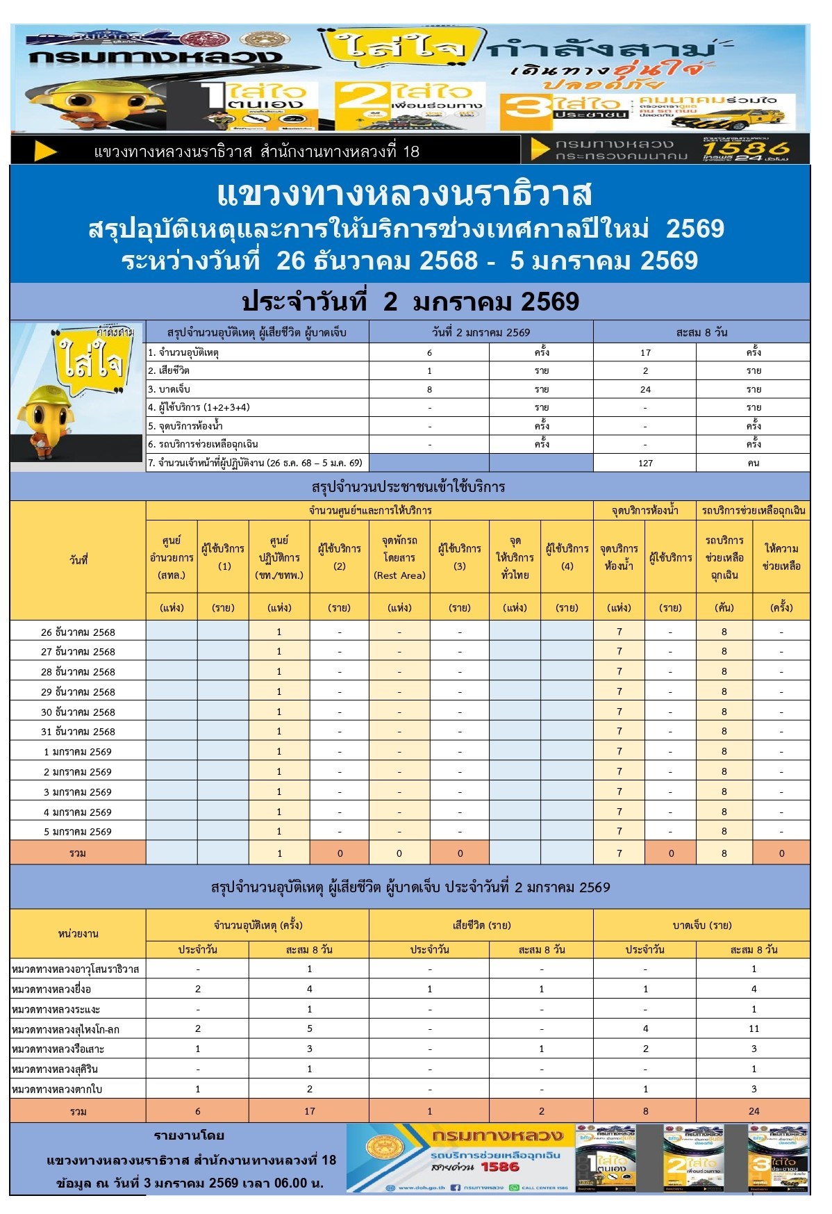 สรุปรายงานอุบัติเหตุและการให้บริการช่วงเทศกาลปีใหม่ 2569 ประจำวันที่ 3 มกราคม 2569