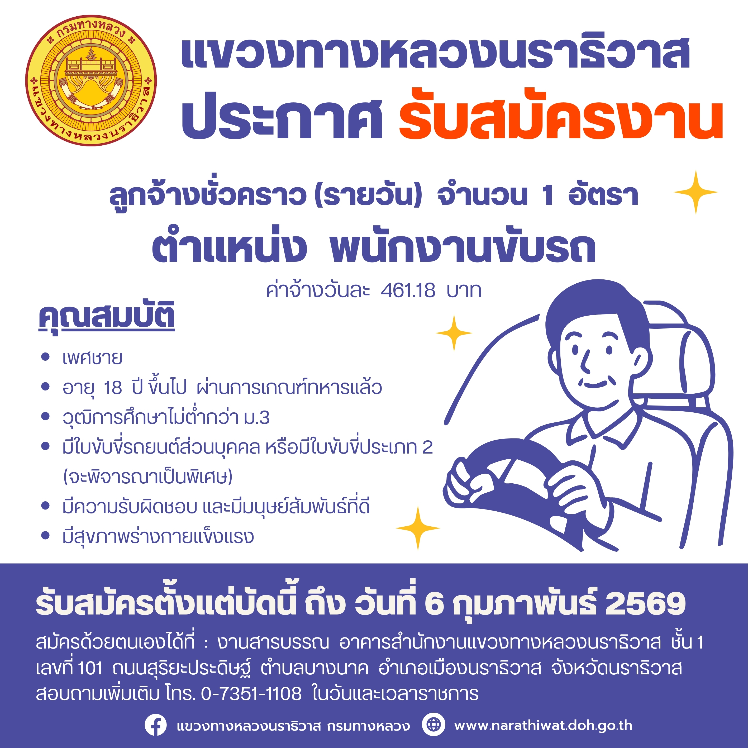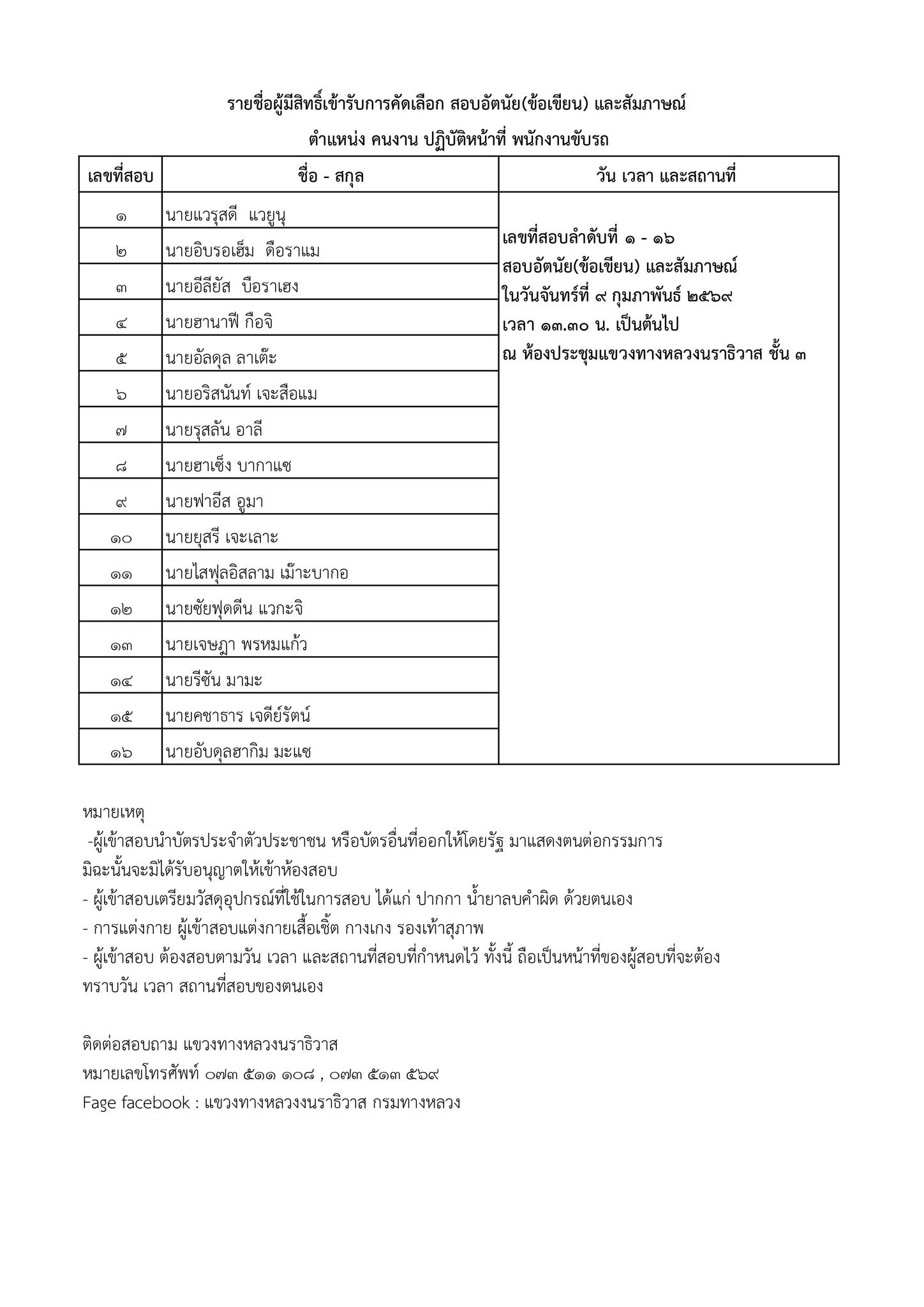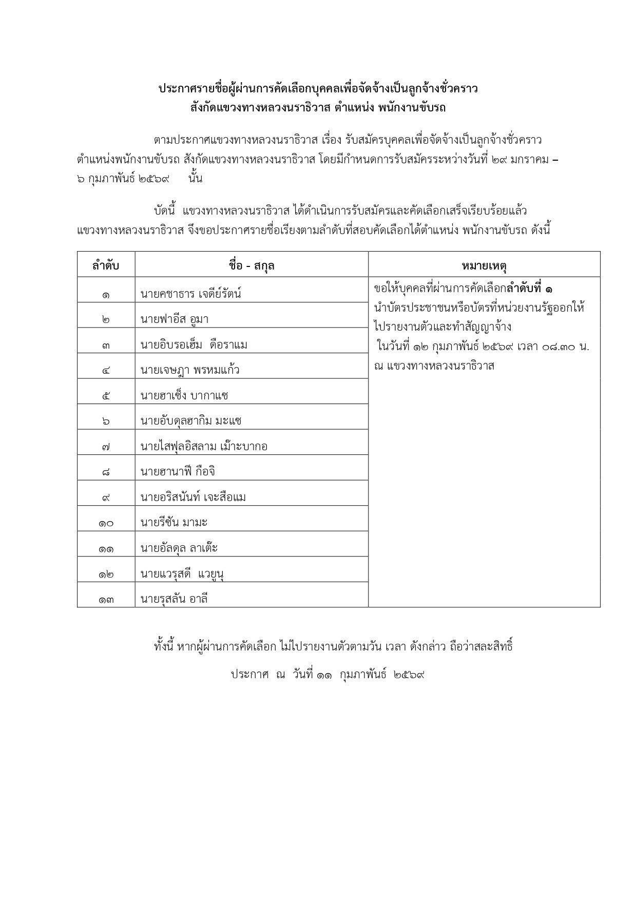ประกาศรายชื่อผู้ผ่านการคัดเลือกบุคคลเพื่อจัดจ้างเป็นลูกจ้างชั่วคราว สังกัดแขวงทางหลวงนราธิวาส ตำแหน่ง พนักงานขับรถ