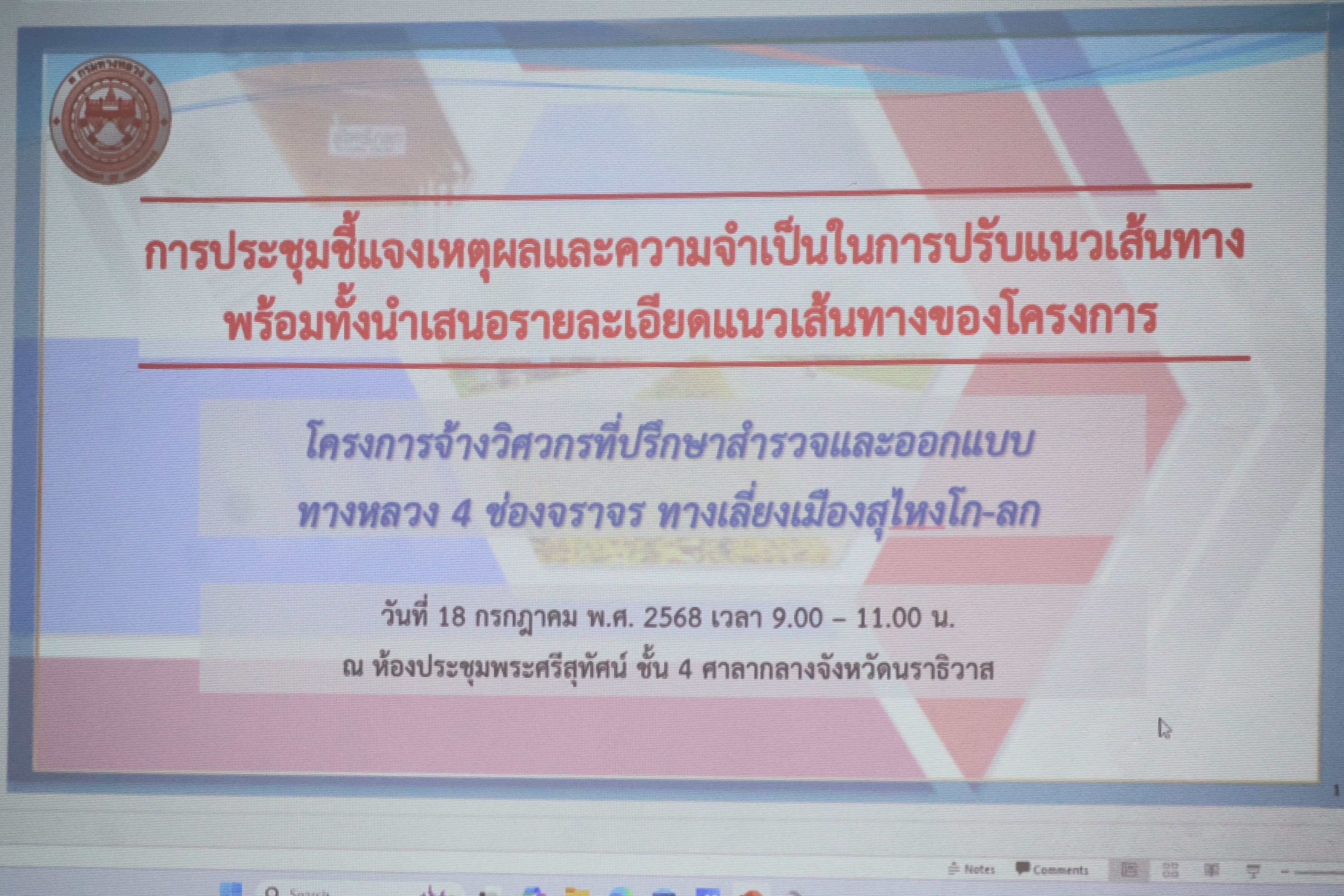แขวงฯนราธิวาส ร่วมประชุมชี้แจงเหตุผลและความจำเป็นในการปรับแนวเส้นทางและรายละเอียดแนวเส้นทางของโครงการสำรวจและออกแบบทางหลวง 4 ช่องจราจรทางเลี่ยงเมืองสุไหงโก-ลก