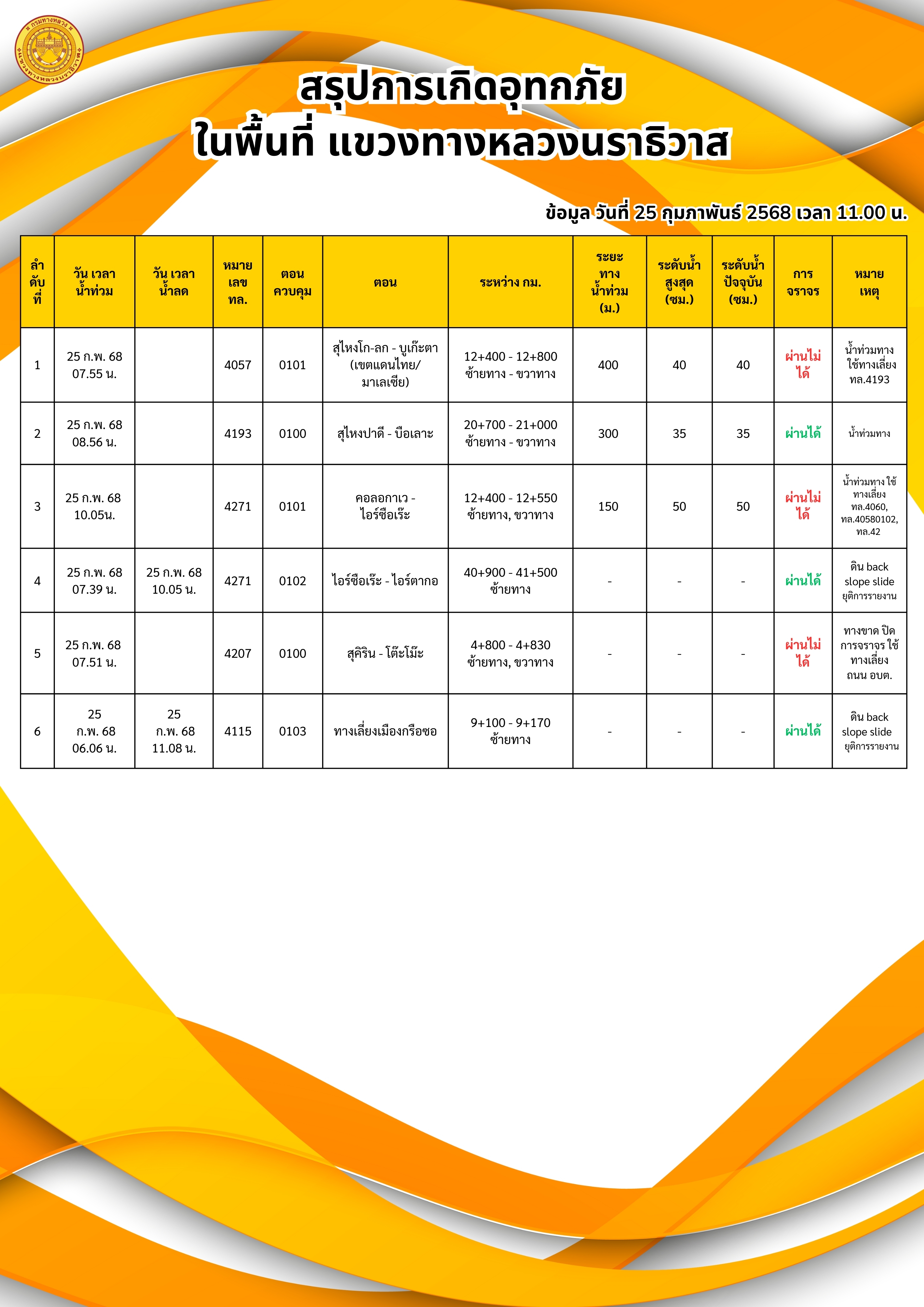 รายงานสถานการณ์อุทกภัยในพื้นที่จังหวัดนราธิวาส วันเวลาที่ update วันที่ 25 ก.พ. 68 เวลา 11.00 น. และ 15.00 น.