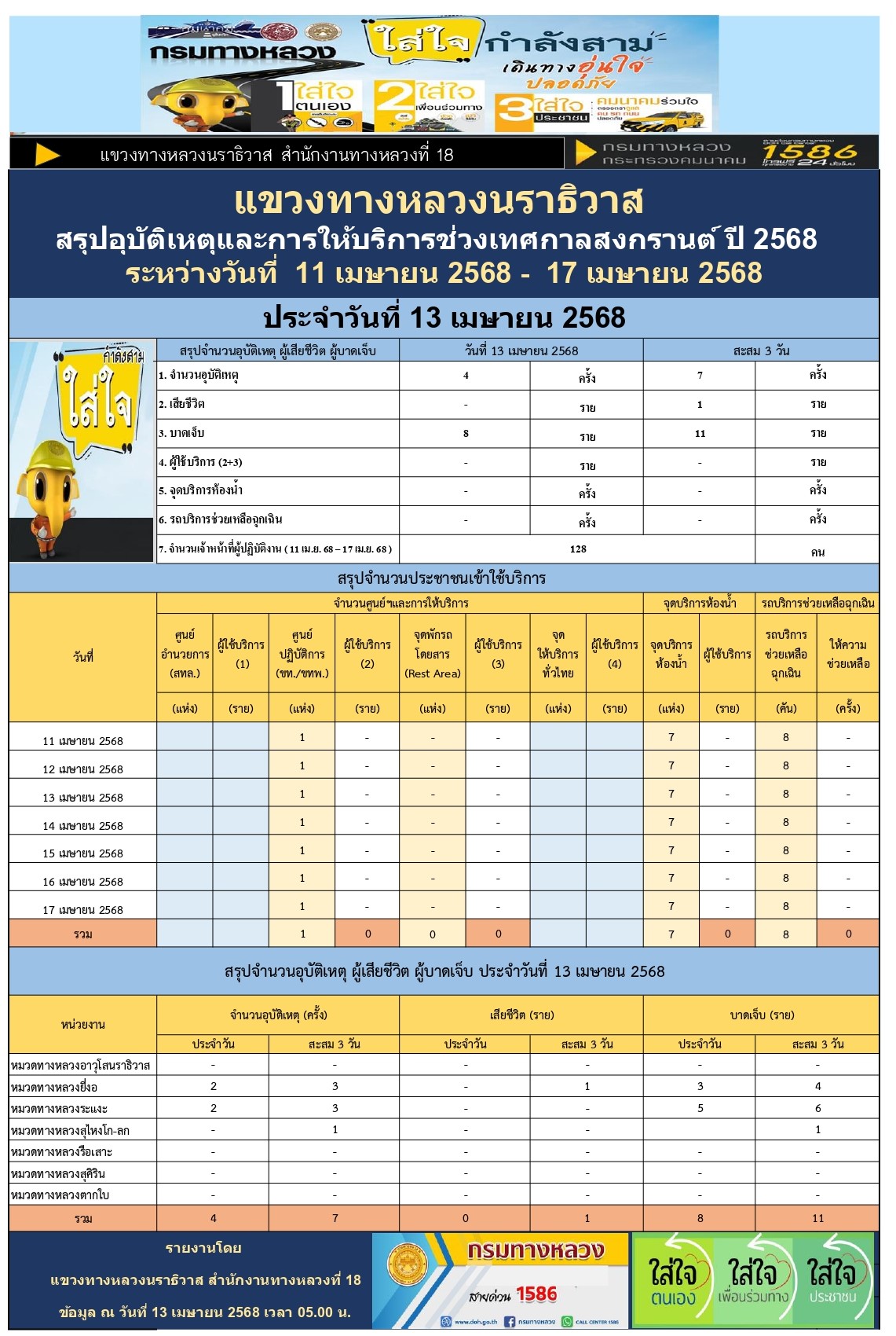 สรุปรายงานอุบัติเหตุและการให้บริการช่วงเทศกาลสงกรานต์ ปี 2568 ประจำวันที่ 13 เมษายน 2568