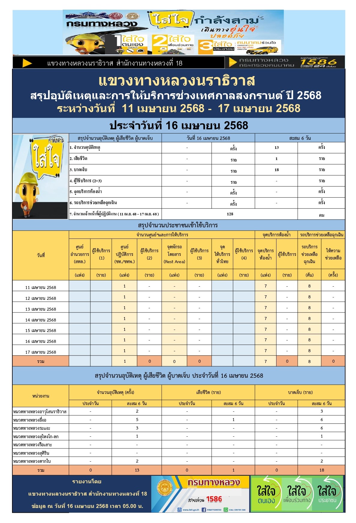 สรุปรายงานอุบัติเหตุและการให้บริการช่วงเทศกาลสงกรานต์ ปี 2568 ประจำวันที่ 16 เมษายน 2568