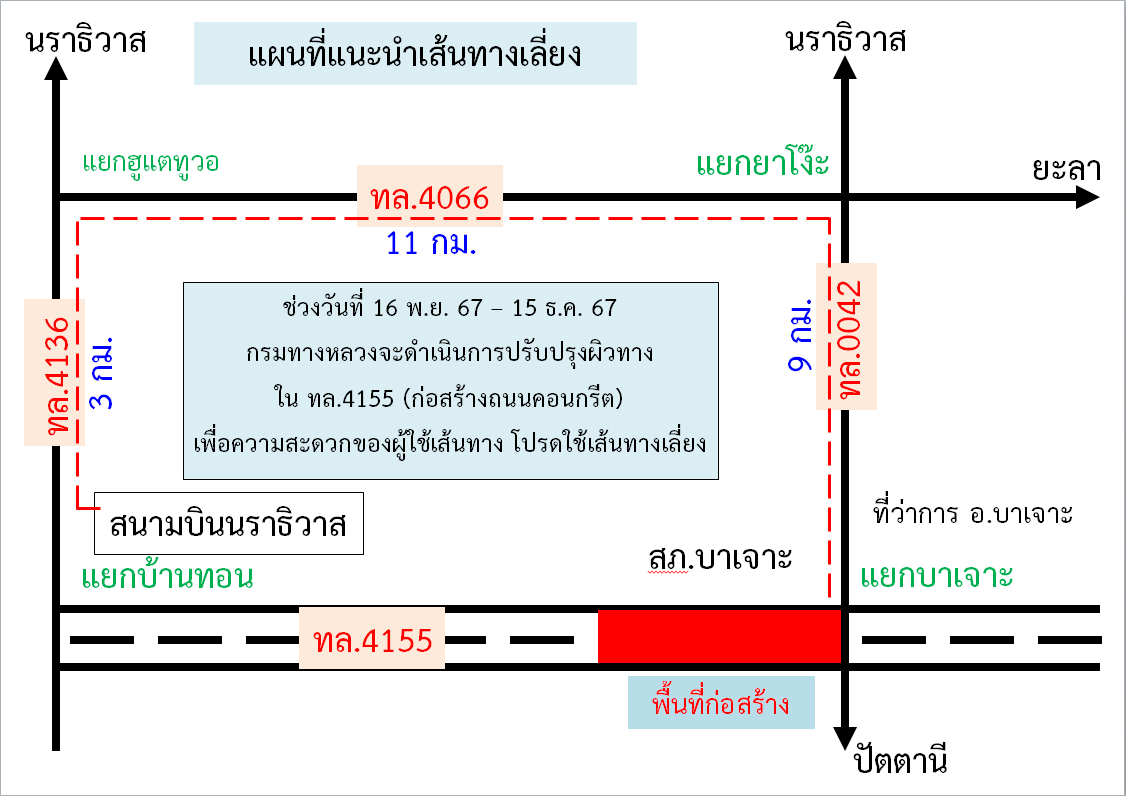 แขวงทางหลวงนราธิวาส ขอแจ้งประชาสัมพันธ์เส้นทางเลี่ยง บริเวณทางหลวงหมายเลข 4155