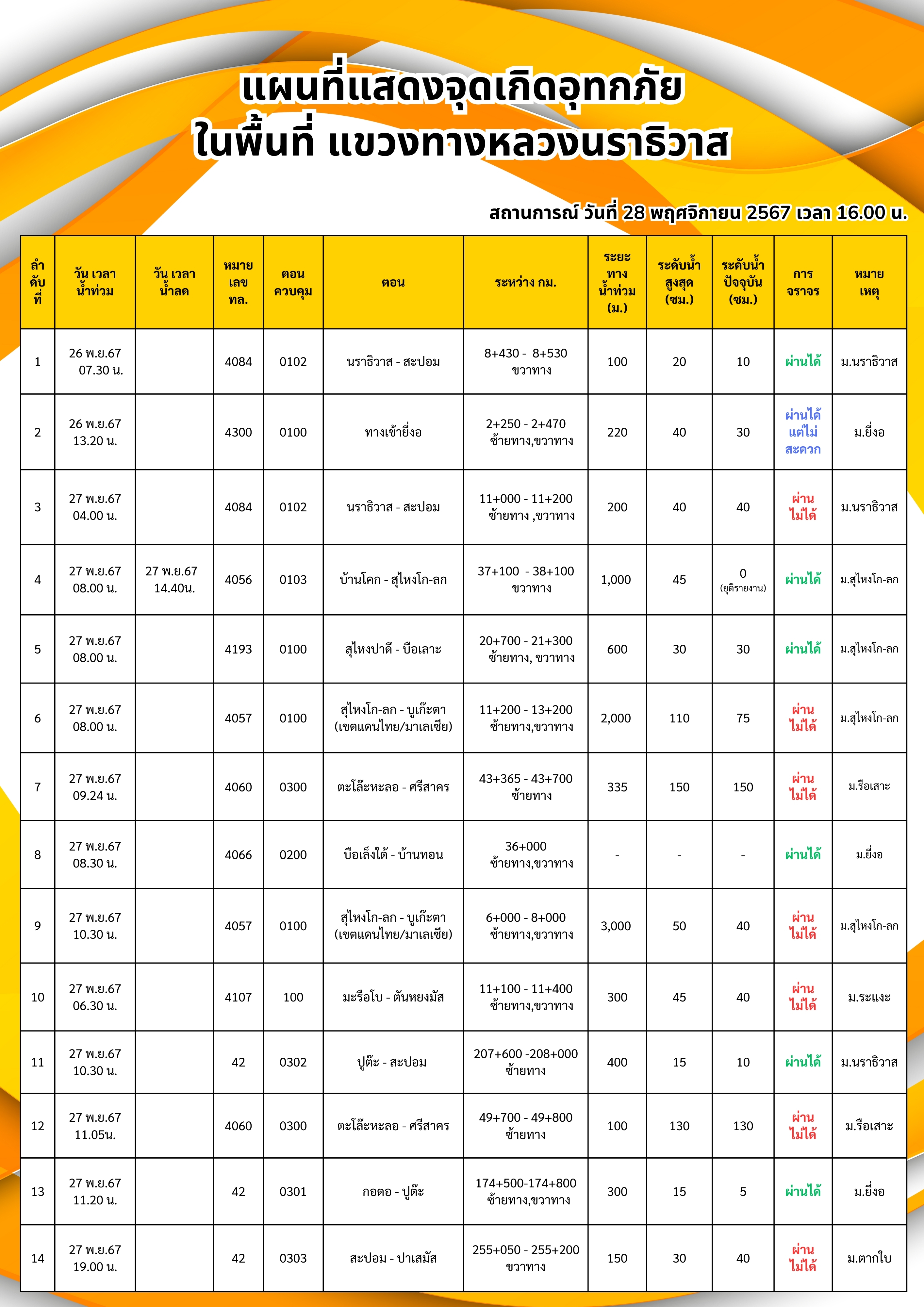 รายงานสถานการณ์อุทกภัยในพื้นที่จังหวัดนราธิวาส วันเวลาที่ update วันที่ 28 พ.ย. 67 เวลา 16.00 น.