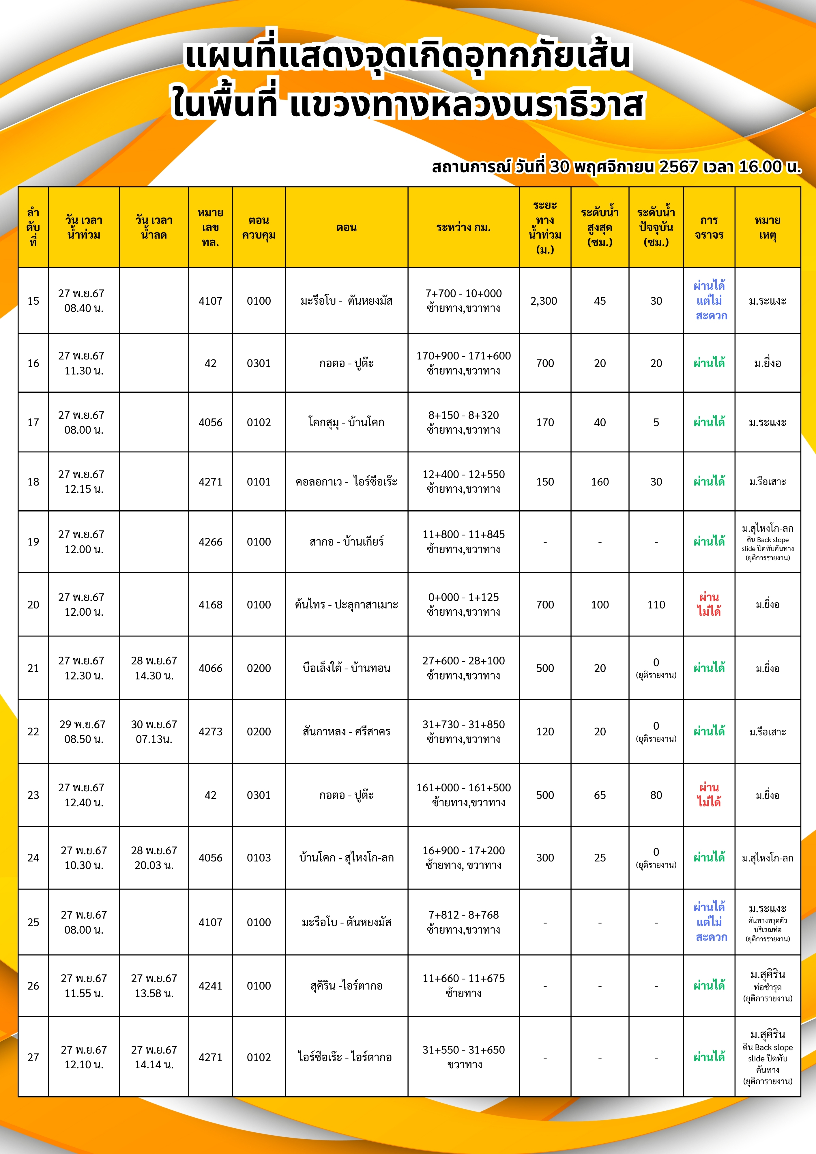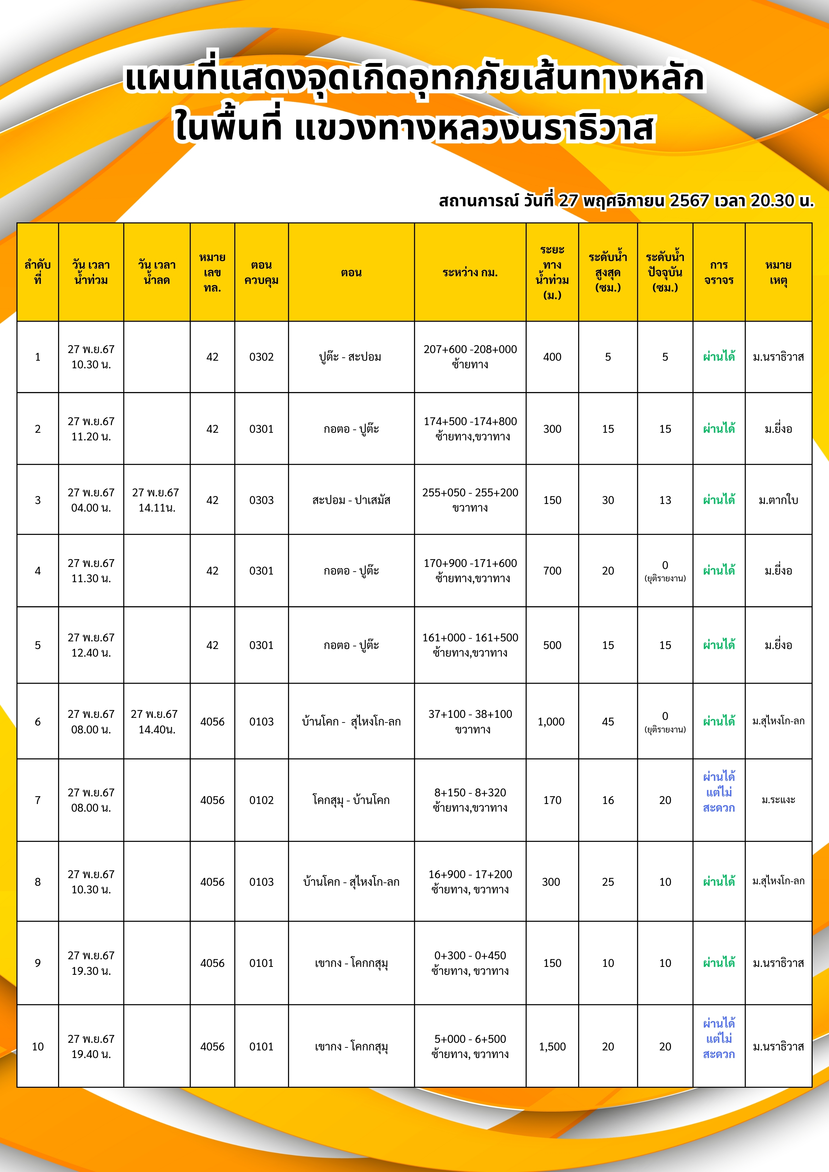 รายงานสถานการณ์อุทกภัยเส้นทางหลัก ได้แก่ ทล.42 และ ทล.4056 ในพื้นที่จังหวัดนราธิวาส วันเวลาที่ update วันที่ 27 พ.ย. 67 เวลา 20.30 น.