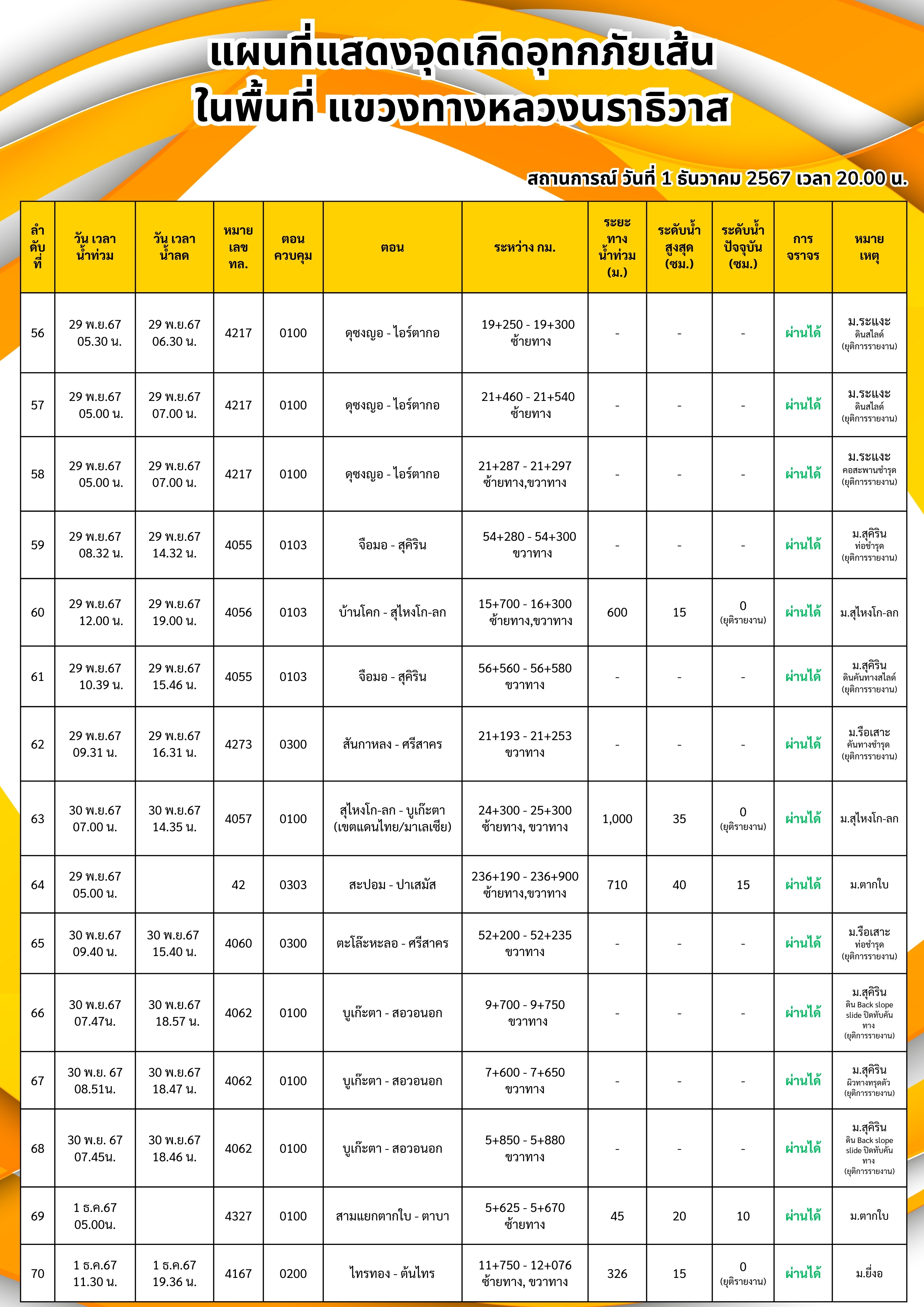 แขวงทางหลวงนราธิวาส ขอรายงานสถานการณ์อุทกภัยในพื้นที่จังหวัดนราธิวาส วันเวลาที่ update วันที่ 5 ธ.ค. 67 เวลา 20.00 น.