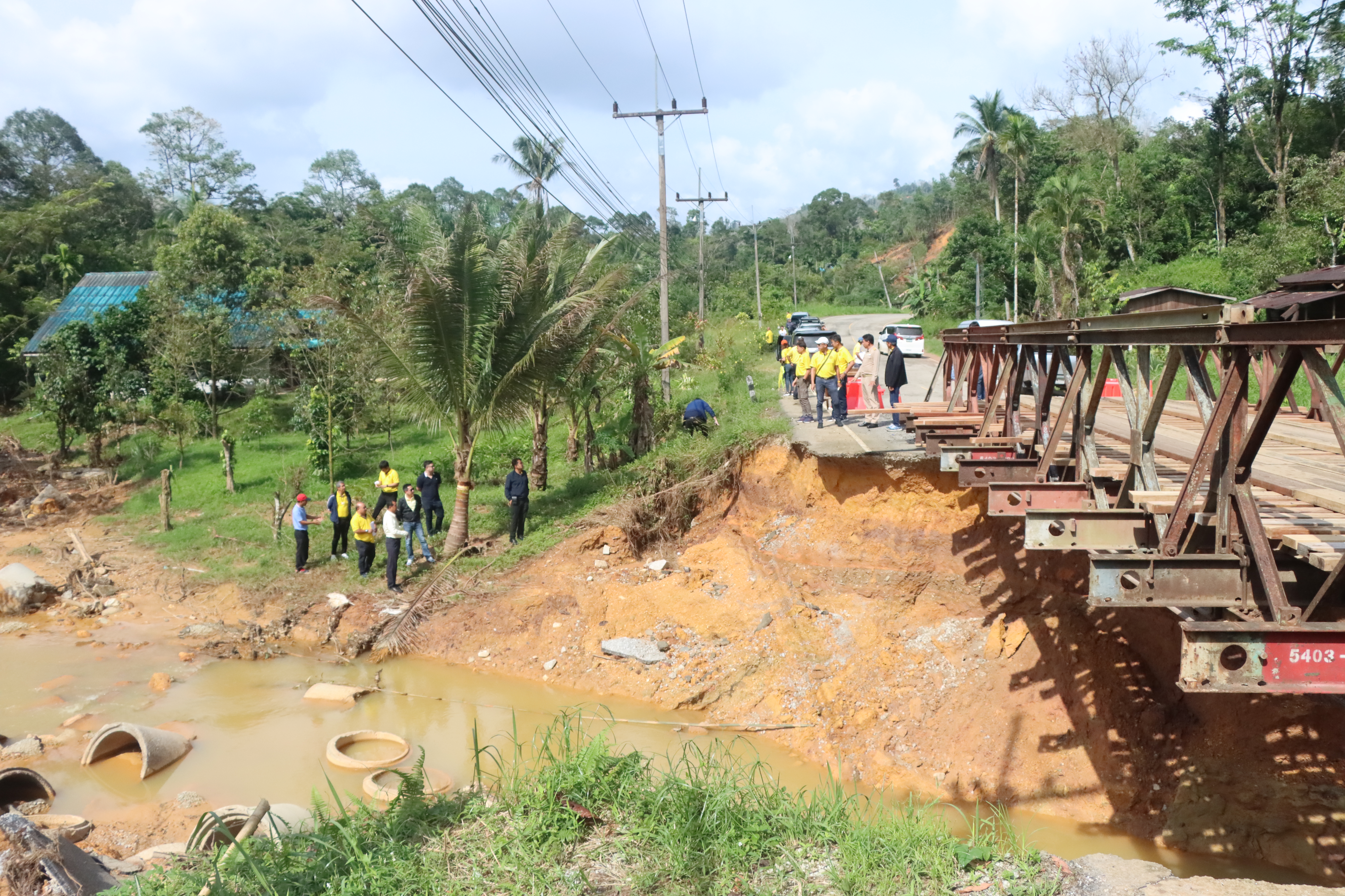 นายจิระพงศ์ เทพพิทักษ์ รองอธิบดีฝ่ายบำรุงทาง ลงพื้นที่ติดตามปัญหา และตรวจเส้นทางจากเหตุอุทกภัยในพื้นที่จังหวัดนราธิวาส โดยมีนายจอมปวีร์ จันทร์หิรัญ ผู้อำนวยการสำนักงานทางหลวงที่ 18 นายสมัคร เลือดวงหัด ผู้อำนวยการแขวงทางหลวงนราธิวาส พร้อมด้วยผู้อำนวยการส่วน ข้าราชการ และเจ้าหน้าที่ในสังกัด ร่วมลงพื้นที่ตรวจสอบจุดที่ได้รับผลกระทบจากอุทกภัย บริเวณทางหลวงหมายเลข 42410100 ตอน สุคิริน - ไอร์ตากอ ระหว่าง กม.10+220 ถึง กม.10+230 ตำบลสุคิริน อำเภอสุคิริน จังหวัดนราธิวาส เนื่องจากได้รับความเสียหายจากฝนตกหนักติดต่อกันเป็นระยะเวลาหลายวัน ตั้งแต่ 24 ธันวาคม 2566 - 4 มกราคม 2567 ที่ผ่านมา เกิดน้ำท่วม และน้ำป่าไหลหลาก ส่งผลให้ถนนถูกกัดเซาะได้รับความเสียหาย ประชาชนในพื้นที่ไม่สามารถสัญจรไปมาได้ จากสถานการณ์ฝนตกหนักอย่างต่อเนื่อง โดยจุดดังกล่าวศูนย์สร้างและบูรณะสะพานที่ 4 (นครศรีธรรมราช) ดำเนินการติดตั้งสะพานเบลีย์เพื่อเชื่อมทางขาด โดยแขวงทางหลวงนราธิวาส และสำนักงานทางหลวงที่ 18 ร่วมดำเนินการจนแล้วเสร็จในวันที่ 28 ธันวาคม2566 สามารถเปิดให้ประชาชนใช้สัญจรได้ชั่วคราว