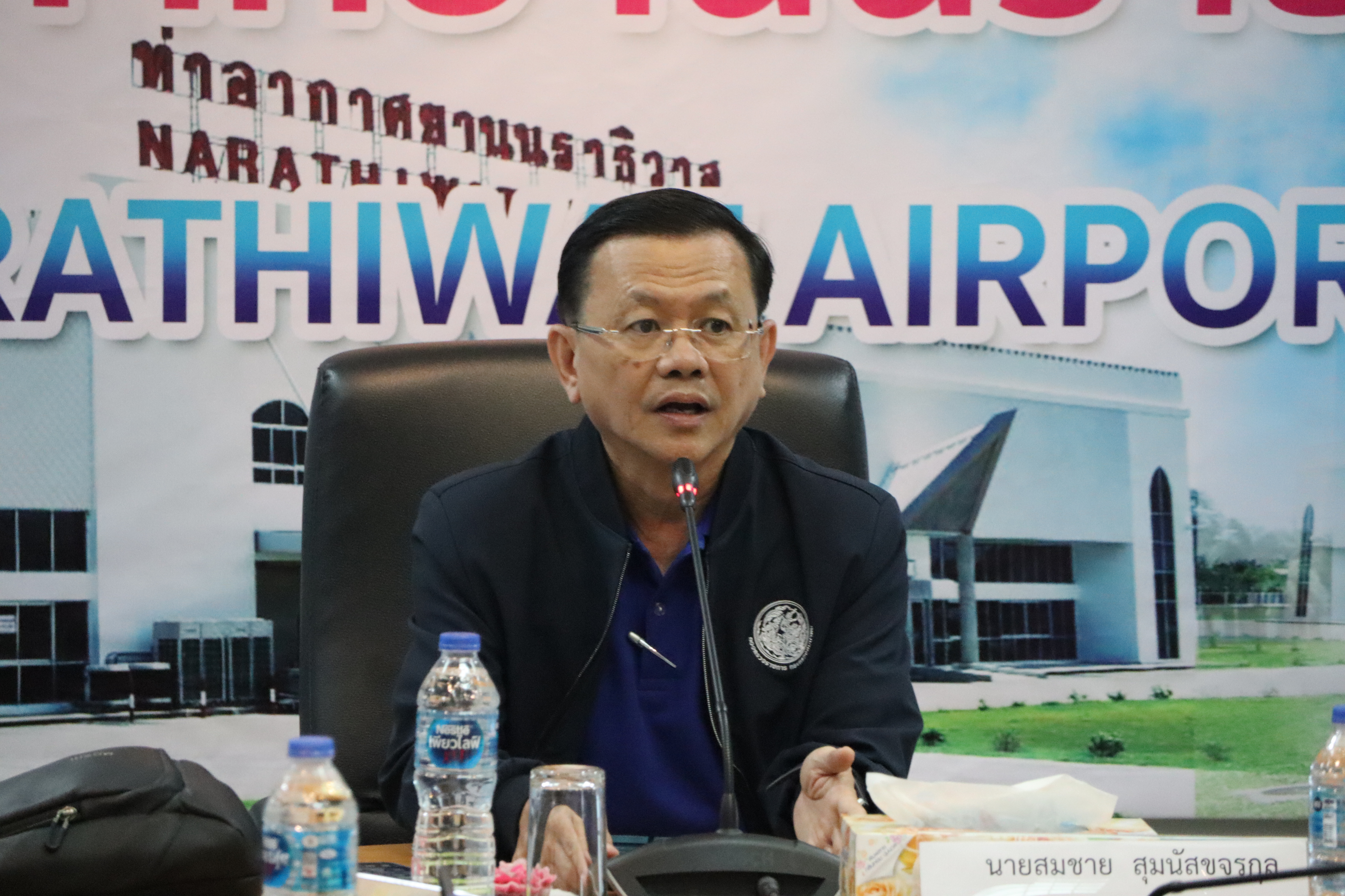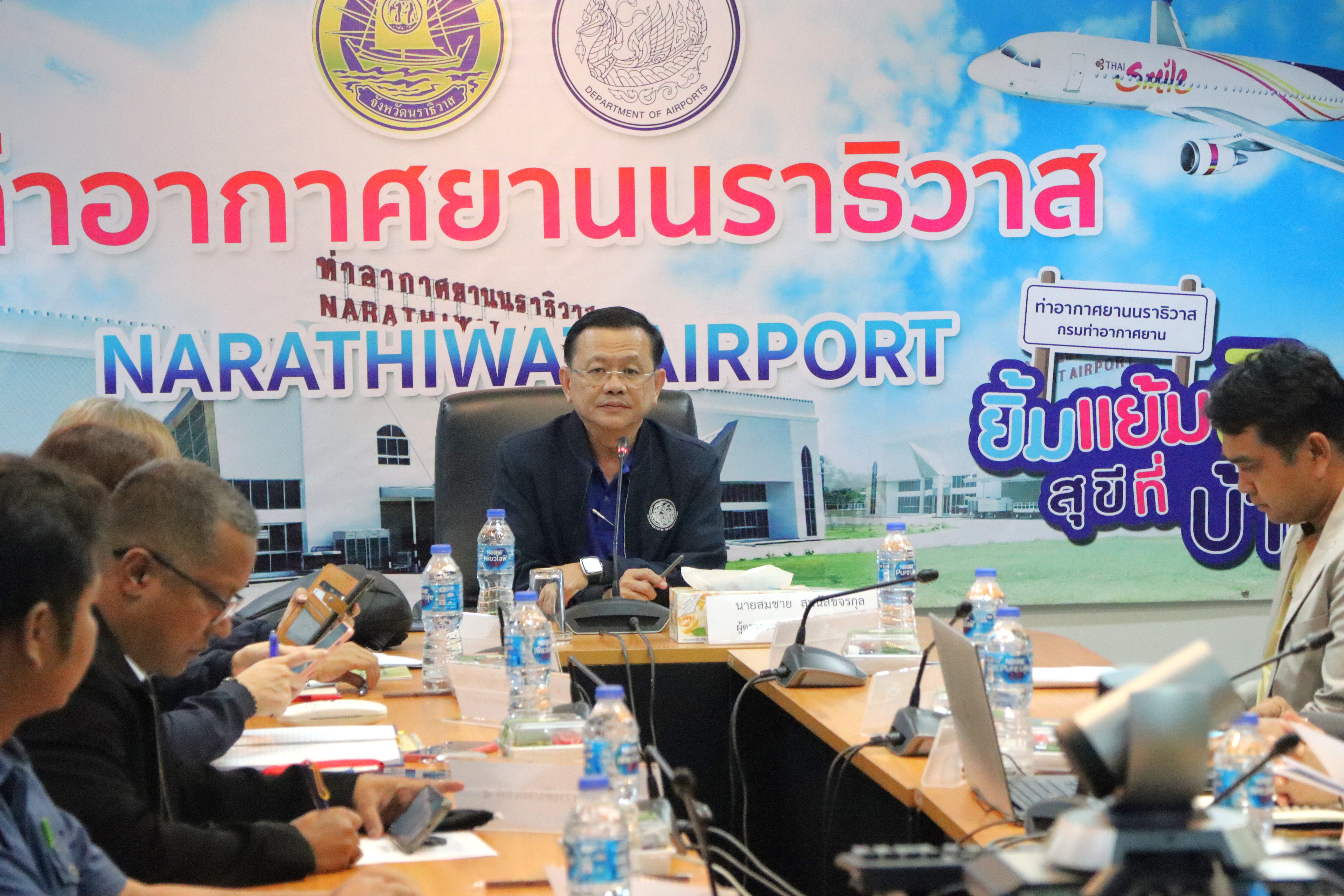 นายจอมปวีร์ จันทร์หิรัญ ผู้อำนวยการสำนักงานทางหลวงที่ 18 นายปฏิเวชวุฒิศักย์ สุขขี ผู้อำนวยการแขวงทางหลวงนราธิวาส พร้อมด้วยผู้อำนวยการส่วนแผนงาน ผู้อำนวยการแขวงทางหลวงในสังกัด นายธวัชชัย เผนานนท์ รองผู้อำนวยการแขวงทางหลวงนราธิวาส (ฝ่ายวิศวกรรม) นางอรัญญา เพ็ชรพูล รองผู้อำนวยการแขวงทางหลวงนราธิวาส (ฝ่ายบริหาร) ร่วมต้อนรับนายสมชาย สุมนัสขจรกุล ผู้ตรวจราชการกระทรวงคมนาคม และคณะฯ เดินทางมาตรวจราชการในพื้นที่เขตตรวจราชการที่ 7 (พื้นที่จังหวัดนราธิวาส) เพื่อตรวจติดตามความก้าวหน้าผลการดำเนินงานของหน่วยงานในสังกัดกระทรวงคมนาคมพื้นที่เขตตรวจราชการที่ 7 (พื้นที่จังหวัดนราธิวาส) ณ ห้องประชุมท่าอากาศยานนราธิวาส ต.โคกเคียน อ.เมืองนราธิวาส จ.นราธิวาส