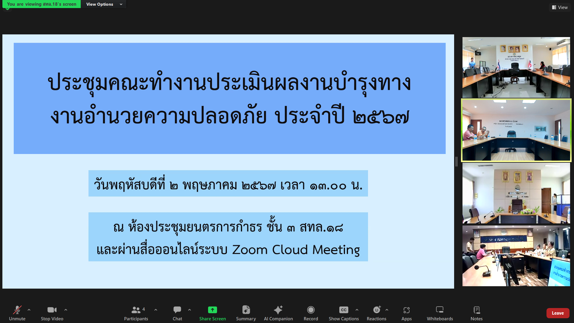 นายปฏิเวชวุฒิศักย์ สุขขี ผู้อำนวยการแขวงทางหลวงนราธิวาส มอบหมายให้นายจำลอง จันสุข รองผู้อำนวยการแขวงทางหลวงนราธิวาส (ฝ่ายปฏิบัติการ) นายธวัชชัย เผนานนท์ รองผู้อำนวยการแขวงทางหลวงนราธิวาส (ฝ่ายวิศวกรรม) นายวีระชัย ปัญญาเถิง ผู้อำนวยการหมวดทางหลวงอาวุโสนราธิวาส ร่วมประชุมเพื่อกำหนดแนวทางการประเมินผลงานบำรุงทางและงานอำนวยความปลอดภัย ประจำปี 2567 ในรูปแบบออนไลน์ ผ่านระบบ Zoom Meeting ณ ห้องประชุม ชั้น 1 แขวงทางหลวงนราธิวาส โดยมีนายศรัณย์รัฐ พวงพัฒน์ ประธานคณะทำงานประเมินผลงานบำรุงทาง งานอำนวยความปลอดภัย ประจำปี 2567 ประจำสำนักงานทางหลวงที่ 18 เป็นประธานการประชุม