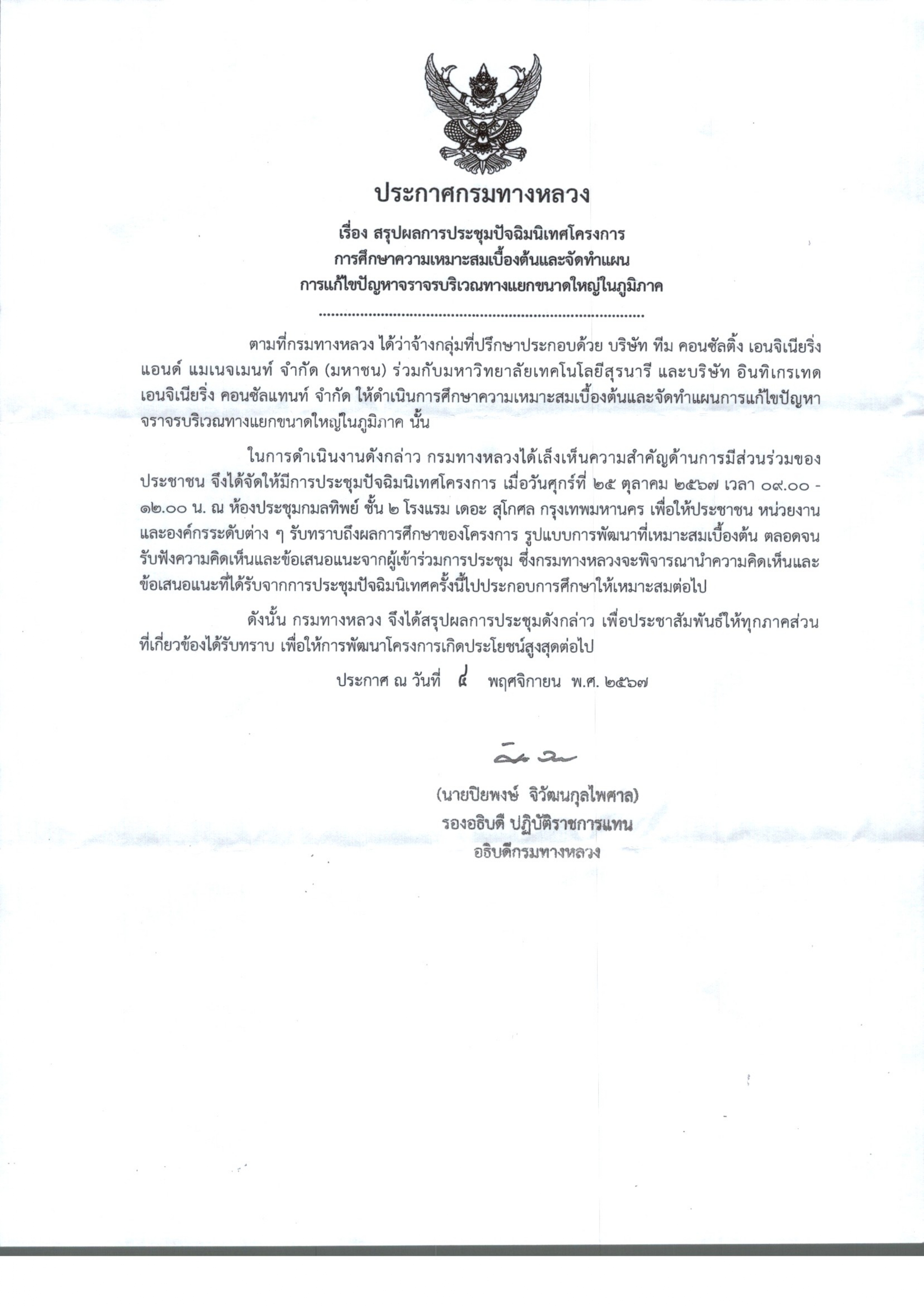 ประกาศประชาสัมพันธ์สรุปผลการประชุมปัจฉิมนิเทศน์โครงการ การศึกษาความเหมาะสมเบื้องต้นและจัดทำแผนการแก้ไขปัญหาการจราจรบริเวณทางแยกขนาดใหญ่ในภูมิภาค