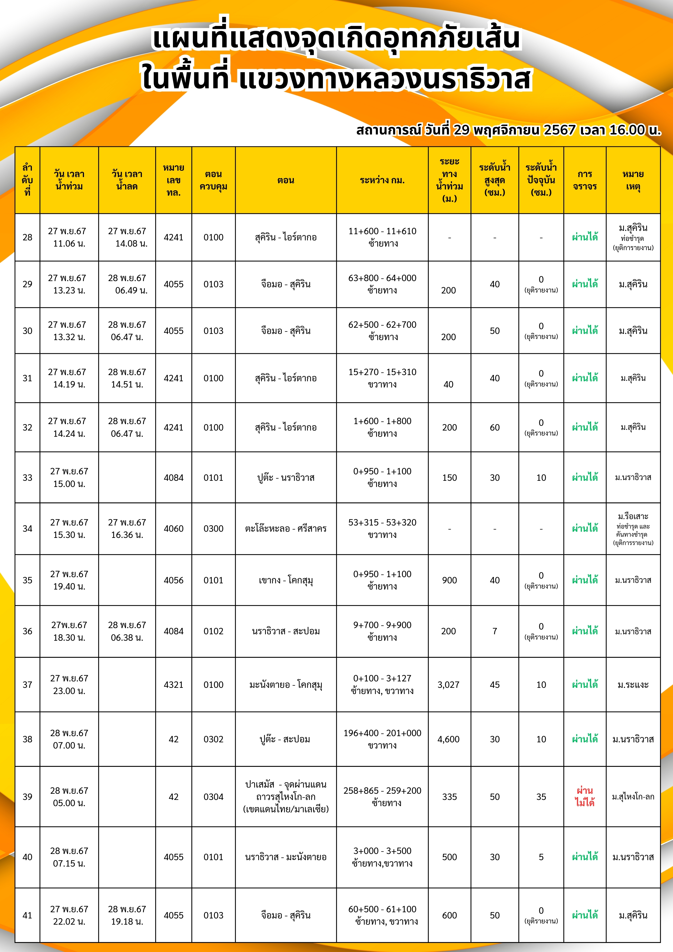 รายงานสถานการณ์อุทกภัยในพื้นที่จังหวัดนราธิวาส วันเวลาที่ update วันที่ 29 พ.ย. 67 เวลา 16.00 น.