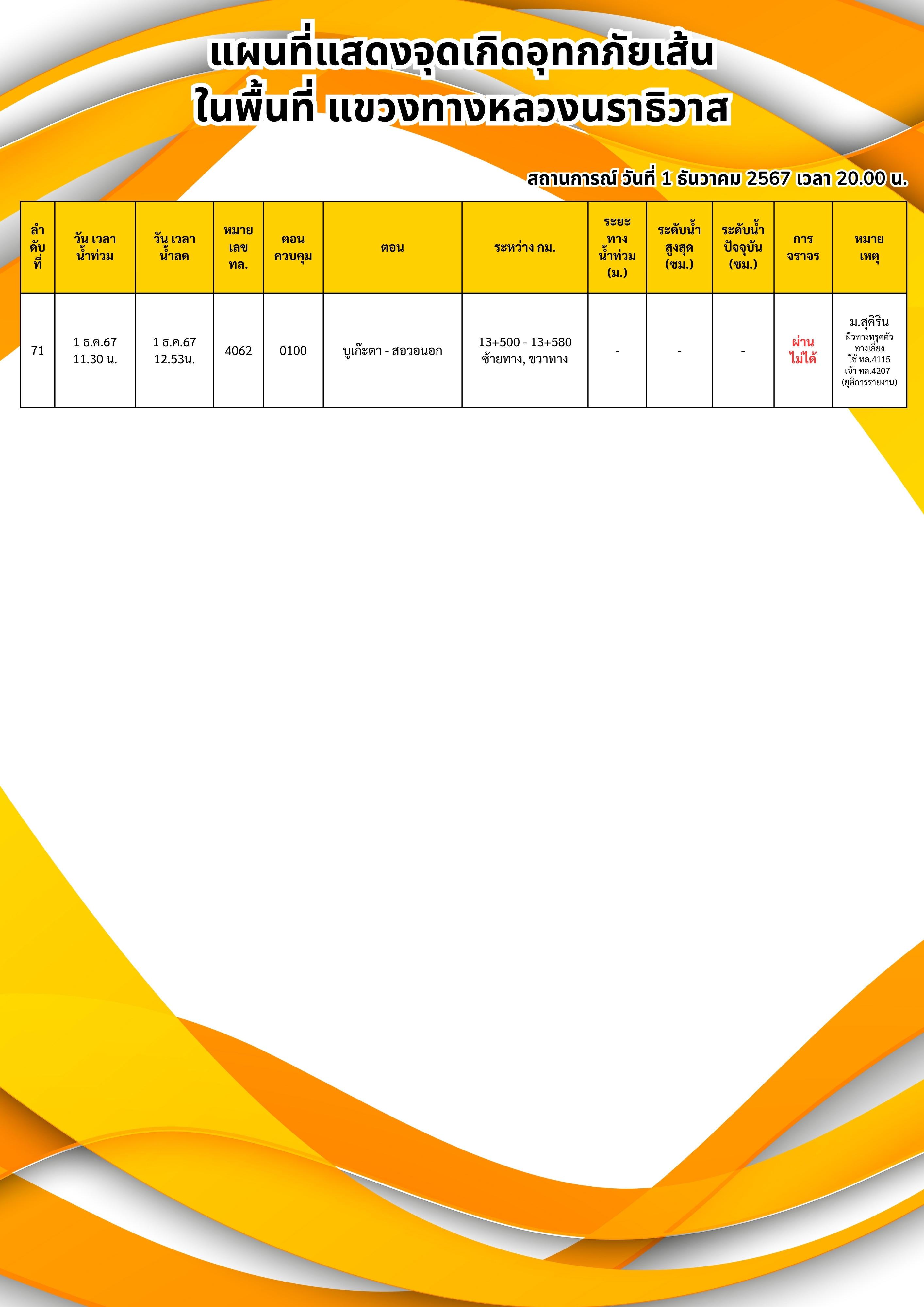 แขวงทางหลวงนราธิวาส ขอรายงานสถานการณ์อุทกภัยในพื้นที่จังหวัดนราธิวาส