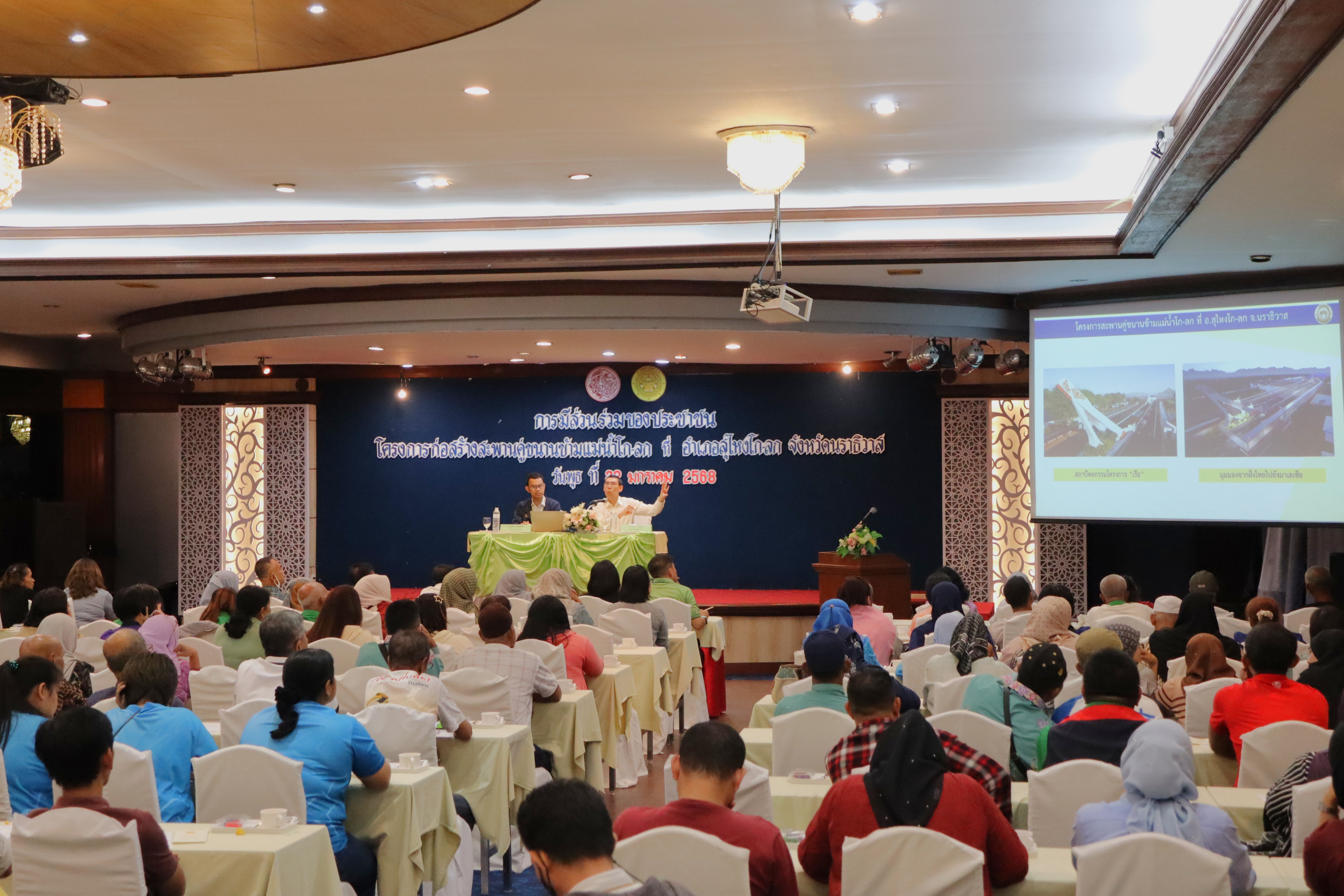 แขวงฯนราธิวาส การดำเนินงานการประชุมเพื่อการมีส่วนร่วมของประชาชน โครงการสะพานคู่ขนานข้ามแม่น้ำโก-ลก ที่ อ.สุไหงโก-ลก จ.นราธิวาส