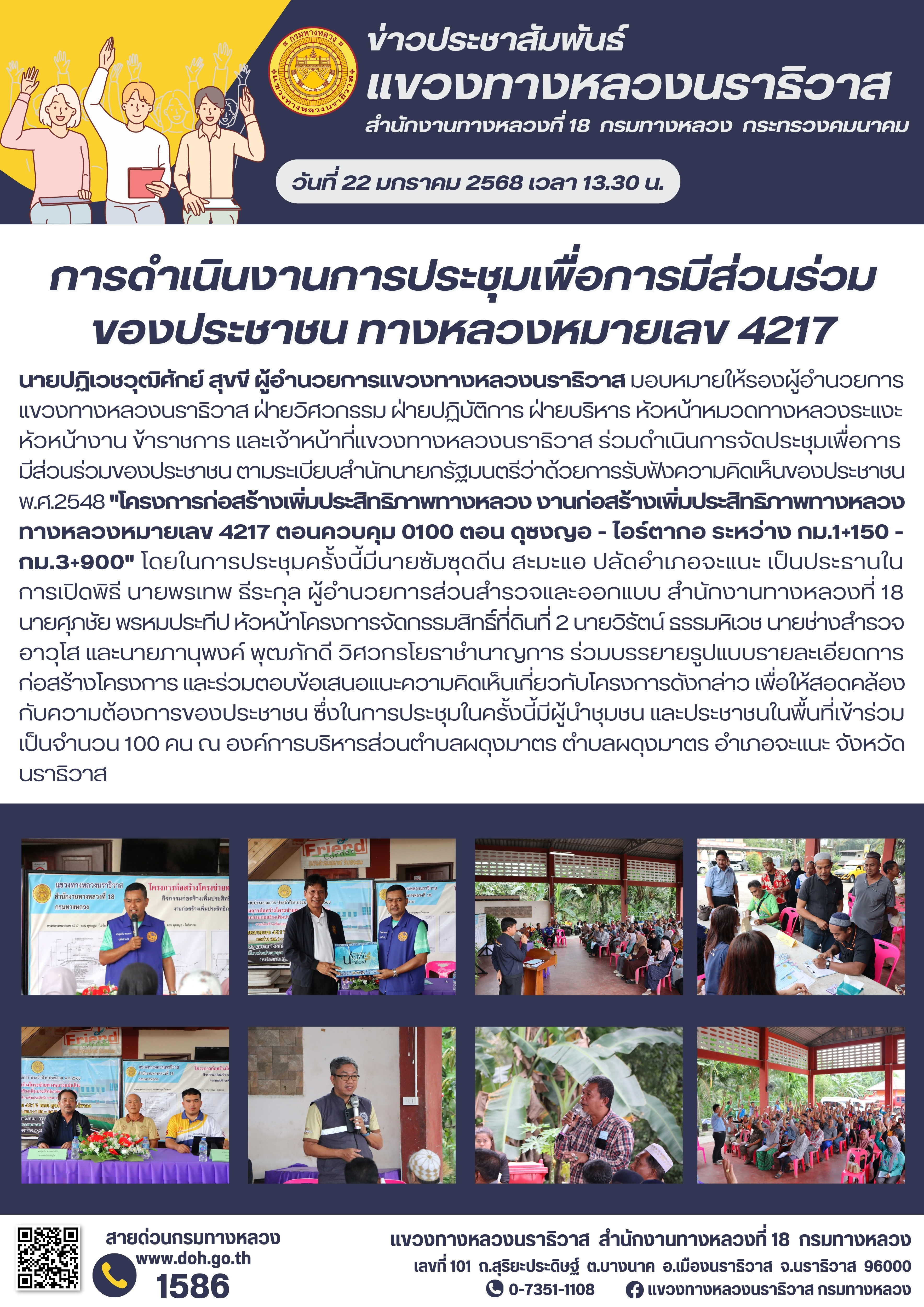 นายปฏิเวชวุฒิศักย์ สุขขี ผู้อำนวยการแขวงทางหลวงนราธิวาส มอบหมายให้รองผู้อำนวยการแขวงทางหลวงนราธิวาส ฝ่ายวิศวกรรม ฝ่ายปฏิบัติการ ฝ่ายบริหาร หัวหน้าหมวดทางหลวงระแงะ หัวหน้างาน ข้าราชการ และเจ้าหน้าที่แขวงทางหลวงนราธิวาส ร่วมดำเนินการจัดประชุมเพื่อการมีส่วนร่วมของประชาชน ตามระเบียบสำนักนายกรัฐมนตรีว่าด้วยการรับฟังความคิดเห็นของประชาชน พ.ศ.2548 "โครงการก่อสร้างเพิ่มประสิทธิภาพทางหลวง งานก่อสร้างเพิ่มประสิทธิภาพทางหลวง ทางหลวงหมายเลข 4217 ตอนควบคุม 0100 ตอน ดุซงญอ - ไอร์ตากอ ระหว่าง กม.1+150 - กม.3+900" โดยในการประชุมครั้งนี้มีนายซัมซุดดีน สะมะแอ ปลัดอำเภอจะแนะ เป็นประธานในการเปิดพิธี นายพรเทพ ธีระกุล ผู้อำนวยการส่วนสำรวจและออกแบบ สำนักงานทางหลวงที่ 18 นายศุภชัย พรหมประทีป หัวหน้าโครงการจัดกรรมสิทธิ์ที่ดินที่ 2 นายวิรัตน์ ธรรมหิเวช นายช่างสำรวจอาวุโส และนายภานุพงค์ พุฒภักดี วิศวกรโยธาชำนาญการ ร่วมบรรยายรูปแบบรายละเอียดการก่อสร้างโครงการ และร่วมตอบข้อเสนอแนะ ความคิดเห็นเกี่ยวกับโครงการดังกล่าว เพื่อให้สอดคล้องกับความต้องการของประชาชน ซึ่งในการประชุมในครั้งนี้มีผู้นำชุมชน และประชาชนในพื้นที่เข้าร่วมเป็นจำนวน 100 คน ณ องค์การบริหารส่วนตำบลผดุงมาตร ตำบลผดุงมาตร อำเภอจะแนะ จังหวัดนราธิวาส