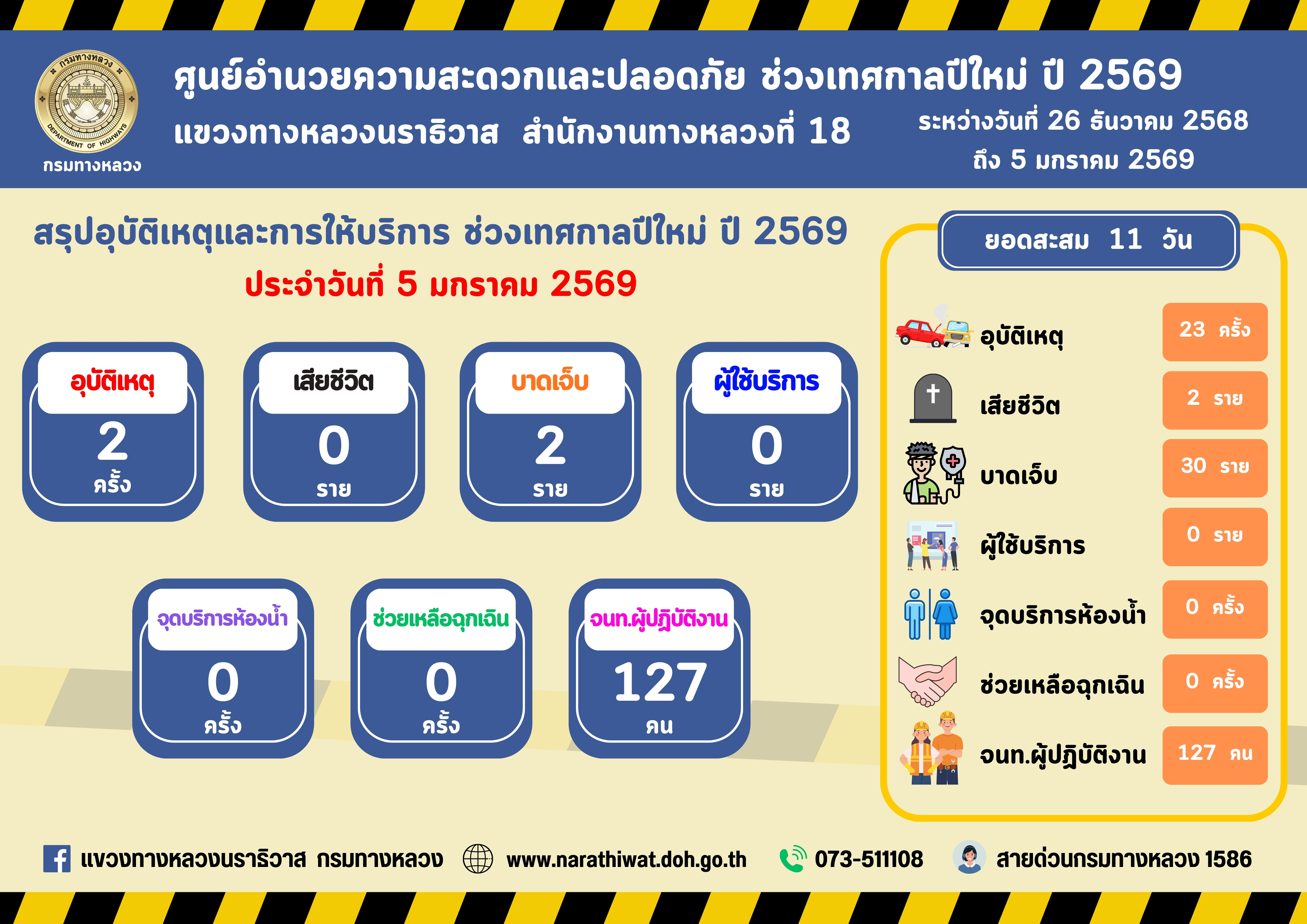 สรุปรายงานอุบัติเหตุและการให้บริการช่วงเทศกาลปีใหม่ 2569 ประจำวันที่ 5 มกราคม 2569