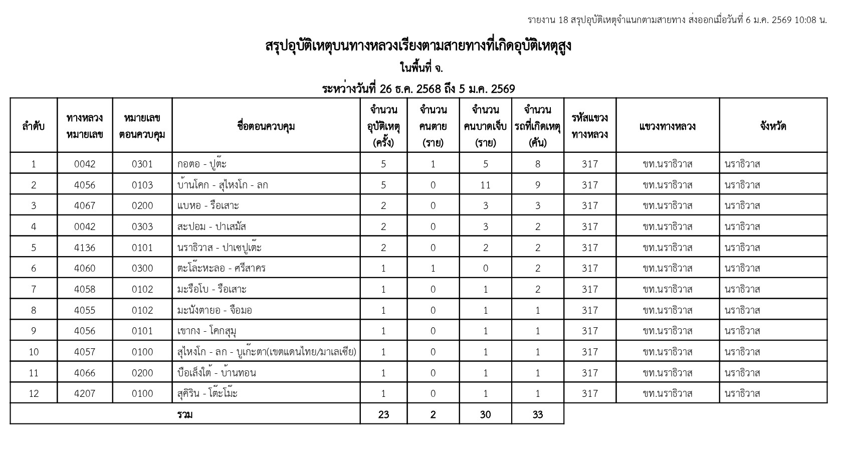| สรุปอุบัติเหตุบนทางหลวงเรียงตามสายทางที่เกิดอุบัติเหตุสูง ในพื้นที่จังหวัดนราธิวาส ระหว่างวันที่ 26 ธ.ค.68 - 5 ม.ค.69 |
