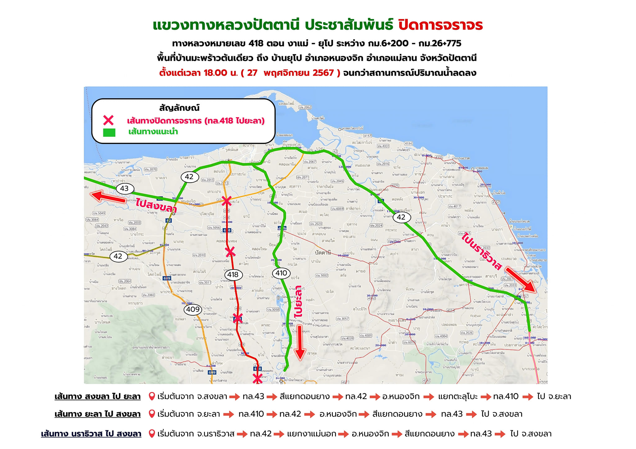 แขวงทางหลวงปัตตานี ขอปิดการจราจรทางหลวงหมายเลข 418 และทางหลวงหมายเลข 43