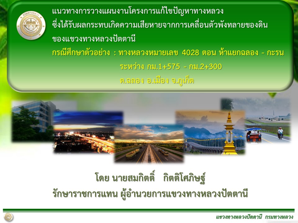 แนวทางการวางแผนงานโครงการแก้ไขปัญหาทางหลวงซึ่งได้รับผลกระทบเกิดความเสียหายจากการเคลื่อนตัวพังทลายของดินของแขวงทางหลวงปัตตานี กรณีศึกษาตัวอย่าง : ทางหลวงหมายเลข 4028 ตอน ห้าแยกฉลอง -กะรน ระหว่าง กม.1+575 -กม.2+300 ต.ฉลอง อ.เมือง จ.ภูเก็ต