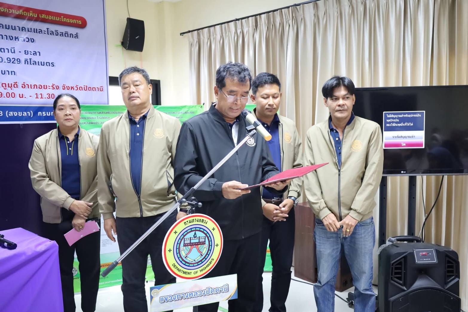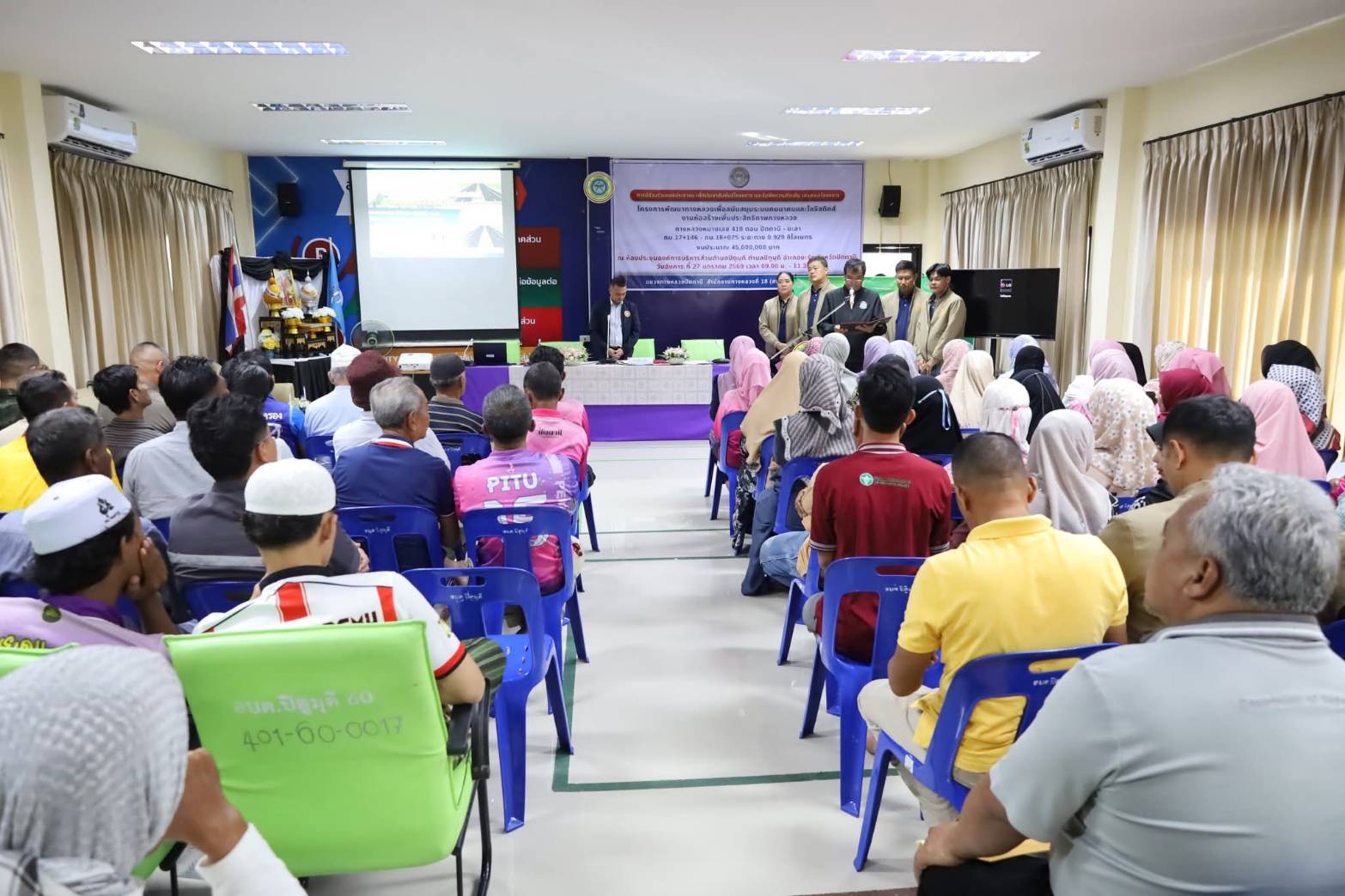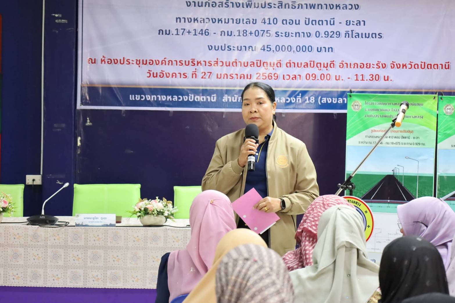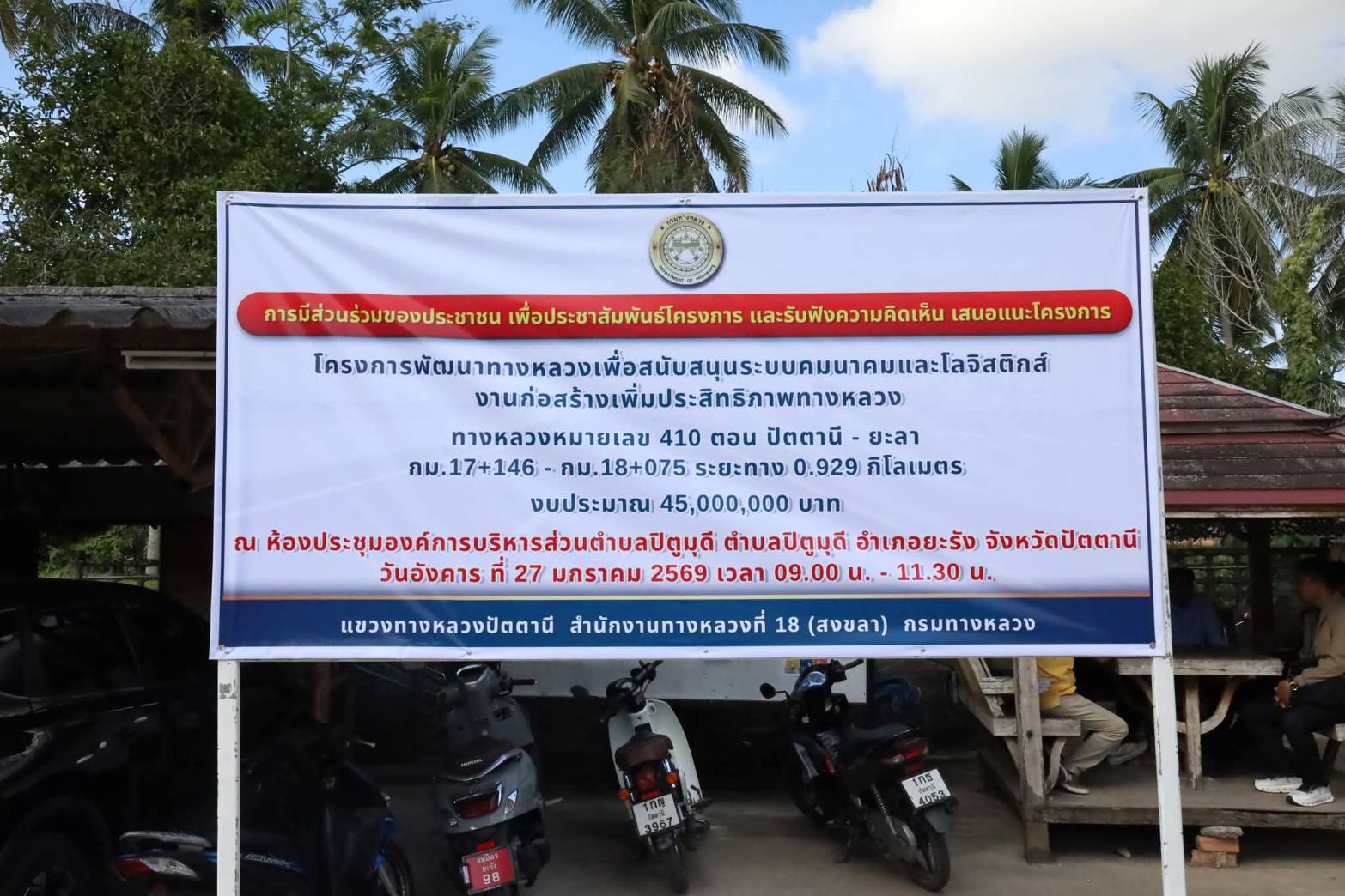 ?? นายสมัคร เลือดวงหัด ผู้อำนวยการแขวงทางหลวงปัตตานี, นายสุวิชัย นวลฉวี รองผู้อำนวยการฯ ฝ่ายปฏิบัติการ, นางอุไรวรรณ มุสิแดง รองผู้อำนวยการฯ ฝ่ายบริหารงานทั่วไป พร้อมด้วย หัวหน้าหมวดทางหลวงยะรัง, หัวหน้างานวางแผน, หัวหน้างานสารสนเทศ, ข้าราชการ และเจ้าหน้าที่ ร่วมดำเนินงานการมีส่วนร่วมของประชาชน ตามระเบียบสำนักนายกรัฐมนตรีว่าด้วยการรับฟังความคิดเห็นของประชาชน พ.ศ. 2548 โครงการก่อสร้างเพิ่มประสิทธิภาพทางหลวง ทางหลวงหมายเลข 410 ตอน ปัตตานี - ยะลา ระหว่าง กม.17+146 - กม.18+075