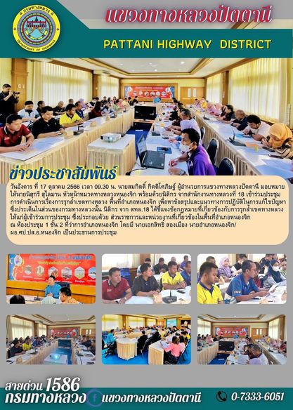 เมื่อวันอังคาร ที่ 17 ตุลาคม 2566 เวลา 09.30 น. นายสมกิตติ์ กิตติโศภิษฐ์ ผู้อำนวยการแขวงทางหลวงปัตตานี มอบหมายให้นายนิสุกรี สุไลมาน หัวหน้าหมวดทางหลวงหนองจิก พร้อมด้วยนิติกร จากสำนักงานทางหลวงที่ 18 เข้าร่วมประชุมการดำเนินการเรื่องการรุกล้ำเขตทางหลวง พื้นที่อำเภอหนองจิก เพื่อหาข้อสรุปและแนวทางการปฎิบัติในการแก้ไขปัญหา ซึ่งประเด็นในส่วนของกรมทางหลวงนั้น นิติกร จาก สทล.18 ได้ชี้แจงข้อกฎหมายที่เกี่ยวข้องกับการรุกล้ำเขตทางหลวง ให้แก่ผู้เข้าร่วมการประชุม ซึ่งประกอบด้วย ส่วนราชการและหน่วยงานที่เกี่ยวข้องในพื้นที่อำเภอหนองจิก ณ ห้องประชุม 1 ชั้น 2 ที่ว่าการอำเภอหนองจิก โดยมี นาย?เอกสิทธิ์? สอง?เมือง? นายอ?ำ?เภอ?หนองจิก?/ผอ.ศป.ปส.อ.หนองจิก? เป็นประธานการประชุม