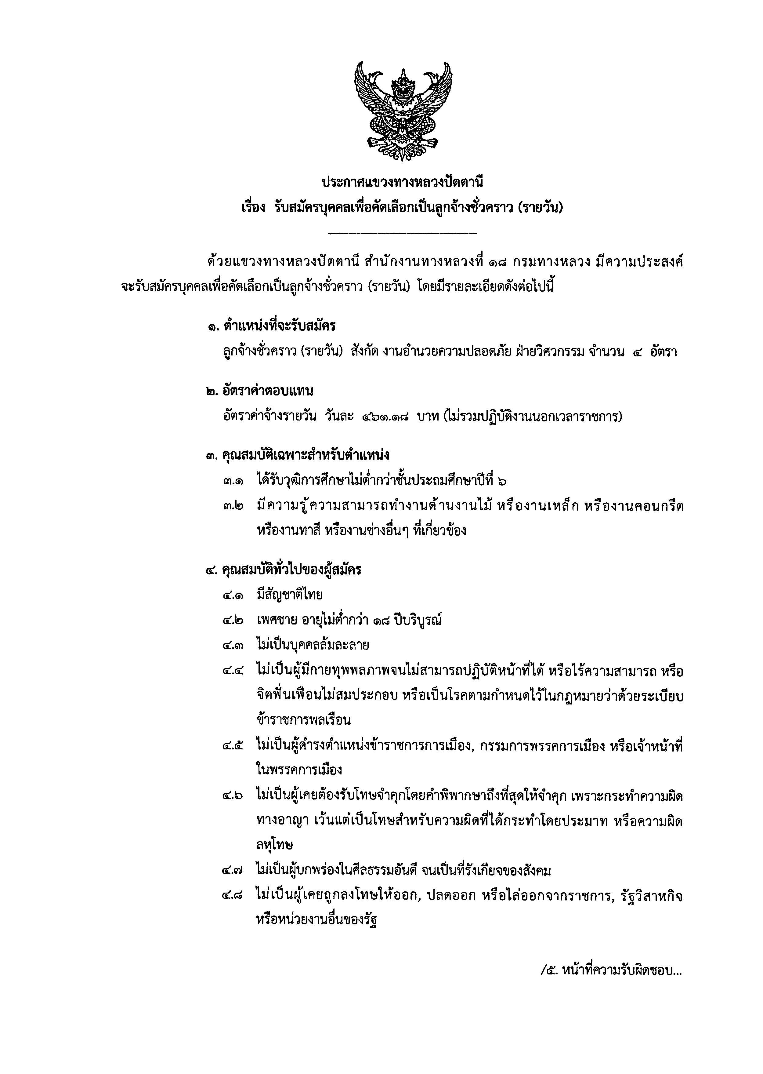 แขวงทางหลวงปัตตานี เปิดรับสมัครบุคคล ตำแหน่งคนงาน ลูกจ้างชั่วคราว (รายวัน) ปฏิบัติงานประจำ งานอำนวยความปลอดภัย จำนวน 4 อัตรา