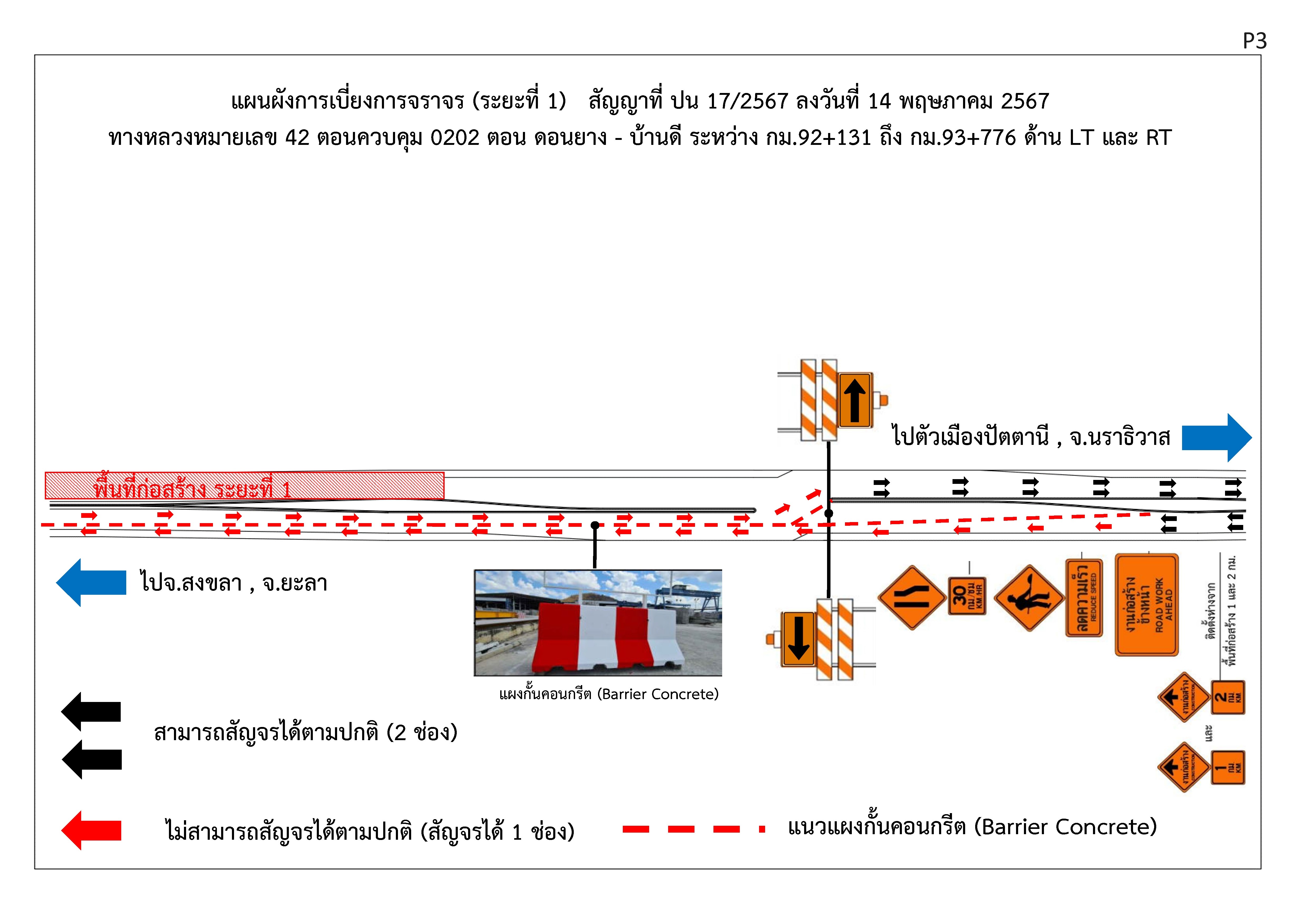 ตามที่แขวงทางหลวงปัตตานี ได้ว่าจ้าง ห้างหุ้นส่วนจำกัด เธียรปรีชาก่อสร้างเป็นผู้รับจ้างโครงการก่อสร้าง งานกิจกรรมบูรณะโครงข่ายทางหลวงระหว่างภาค ทางหลวงหมายเลข 42 ตอนควบคุม 0202 ตอน ดอนยาง - บ้านดี ระหว่าง กม.92+131 - กม.93+776 LT.,RT. ตามสัญญาจ้าง ที่ ปน 17/2567 ลงวันที่ 14 พฤษภาคม 2567 เริ่มต้นสัญญาวันที่ 15 พฤษภาคม 2567 สิ้นสุดสัญญาวันที่ 11 ตุลาคม 2567 ได้เริ่มเข้าดำเนินงานก่อสร้างตามสัญญาดังกล่าวแล้ว อาจส่งผลกระทบทำให้ผู้ใช้เส้นทางและผู้อาศัยอยู่ในบริเวณพื้นที่ก่อสร้างเกิดความไม่สะดวกได้ นั้น