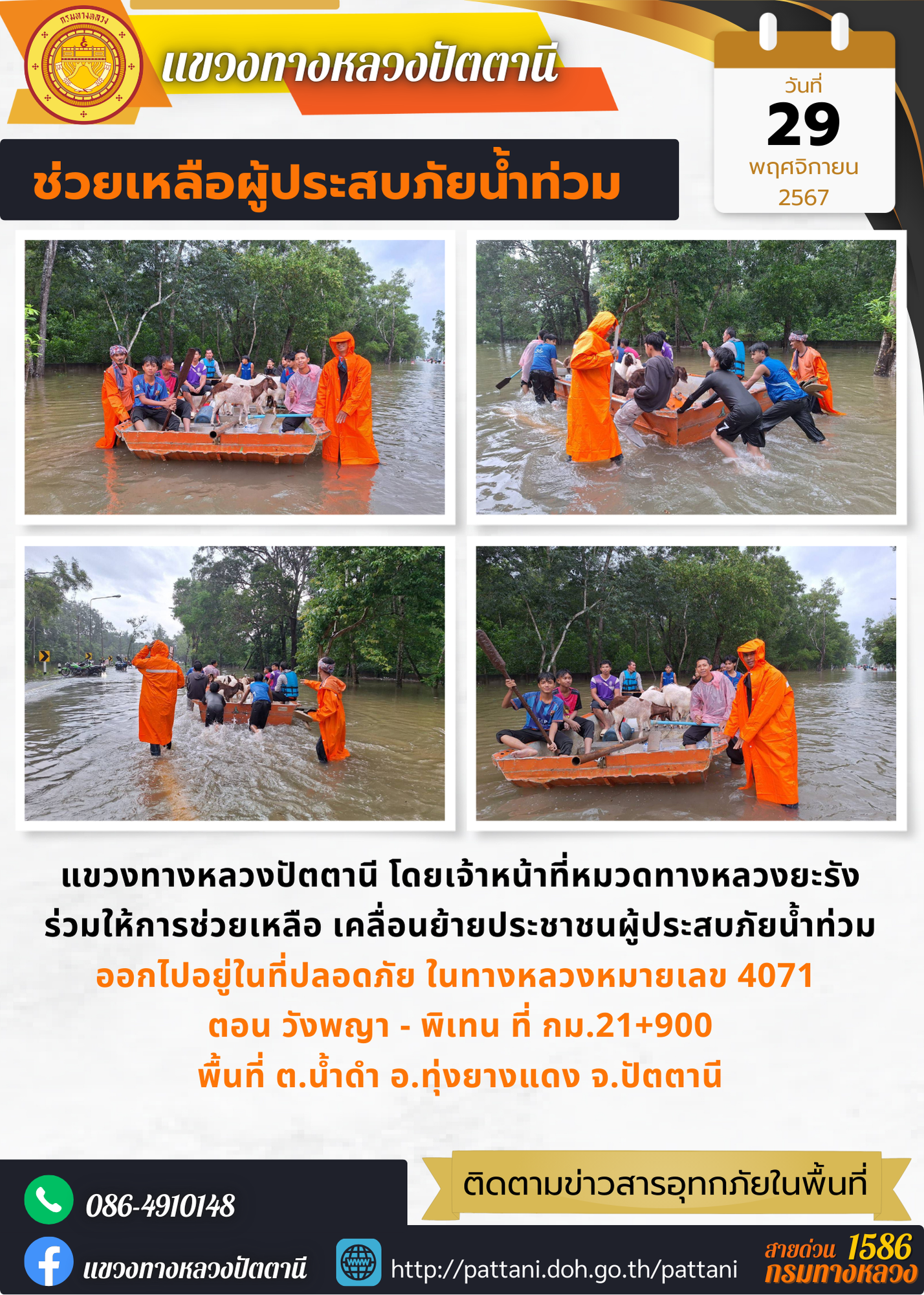 ?? แขวงทางหลวงปัตตานี โดยเจ้าหน้าที่หมวดทางหลวงยะรัง ร่วมให้การช่วยเหลือ เคลื่อนย้ายประชาชนผู้ประสบภัยน้ำท่วมออกไปอยู่ในที่ปลอดภัย ในทางหลวงหมายเลข 4071 ตอนวังพญา - พิเทน ที่ กม.21+900 พื้นที่ ต.น้ำดำ อ.ทุ่งยางแดง จ.ปัตตานี