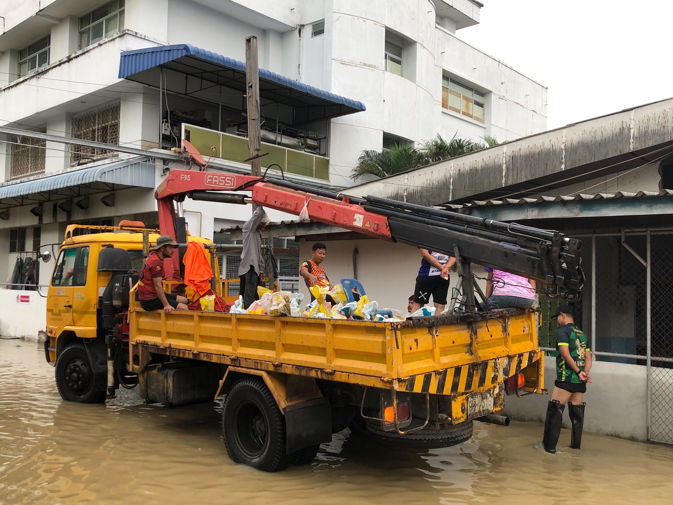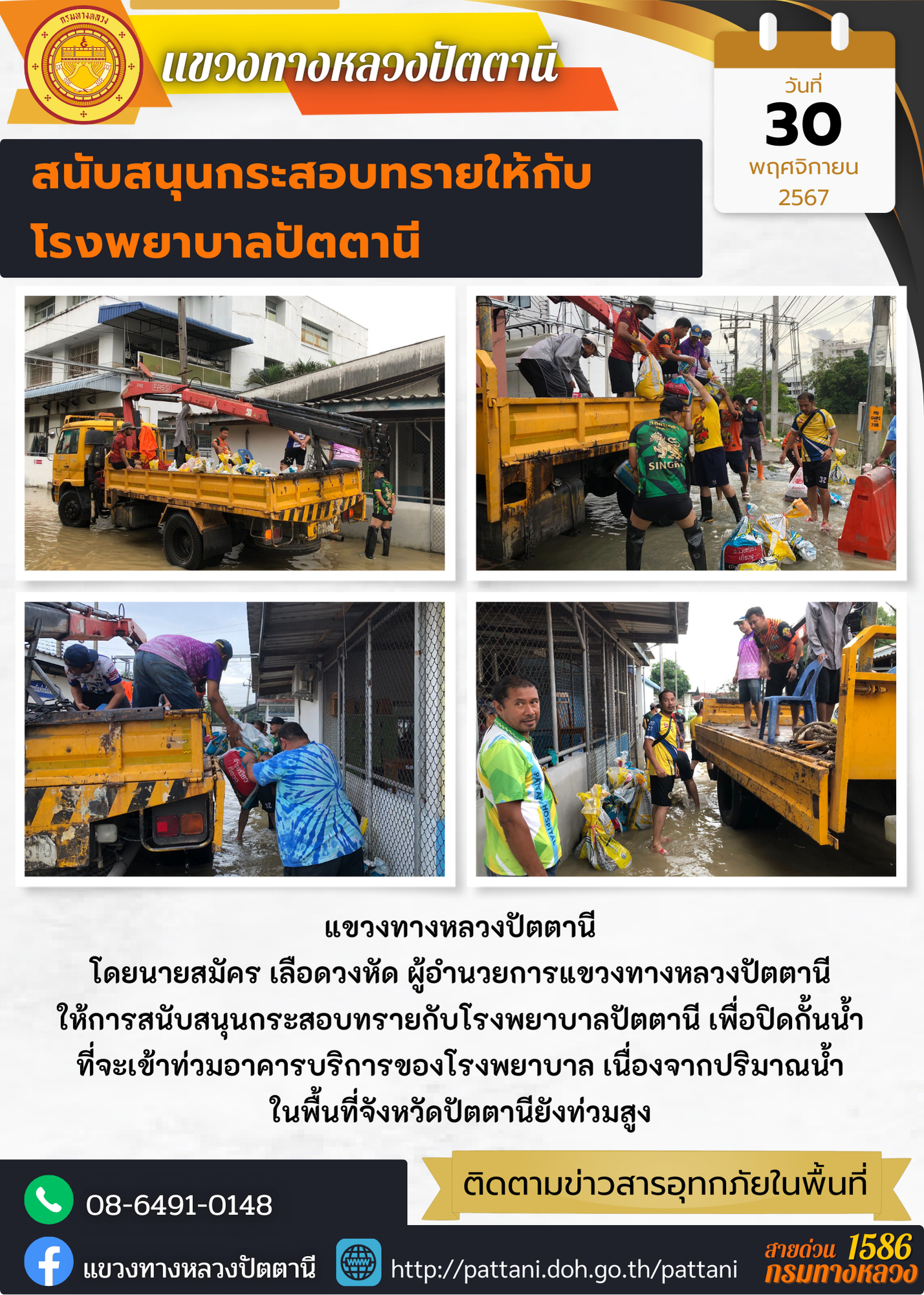 แขวงทางหลวงปัตตานี โดยนายสมัคร เลือดวงหัด ผู้อำนวยการแขวงทางหลวงปัตตานี ให้การสนับสนุนกระสอบทรายกับโรงพยาบาลปัตตานี เพื่อปิดกั้นน้ำที่จะเข้าท่วมอาคารบริการของโรงพยาบาล เนื่องจากปริมาณน้ำในพื้นที่จังหวัดปัตตานียังท่วมสูง