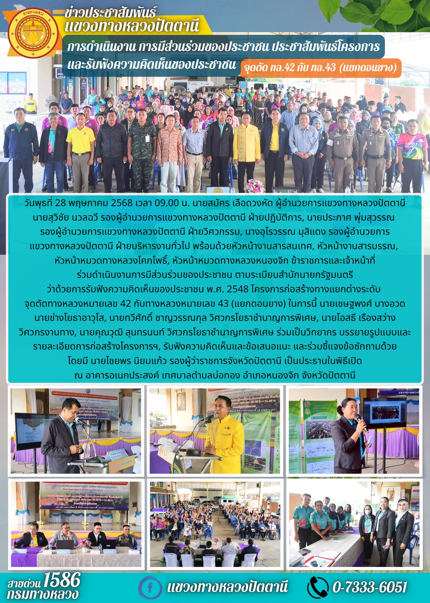 จุดตัดทางหลวงหมายเลข 42 กับทางหลวงหมายเลข 43 (แยกดอนยาง) ในการนี้ นายเชษฐพงศ์ บางอวด นายช่างโยธาอาวุโส, นายทวีศักดิ์ ชาญวรรณกุล วิศวกรโยธาชำนาญการพิเศษ, นายโอสธี เรืองสว่าง วิศวกรงานทาง, นายคุณวุฒิ สุนทรนนท์ วิศวกรโยธาชำนาญการพิเศษ ร่วมเป็นวิทยากร บรรยายรูปแบบและรายละเอียดการก่อสร้างโครงการฯ, รับฟังความคิดเห็นและข้อเสนอแนะ และร่วมชี้แจงข้อซักถามด้วย โดยมี นายไชยพร นิยมแก้ว รองผู้ว่าราชการจังหวัดปัตตานี เป็นประธานในพิธีเปิด ณ อาคารอเนกประสงค์ เทศบาลตำบลบ่อทอง อำเภอหนองจิก จังหวัดปัตตานี