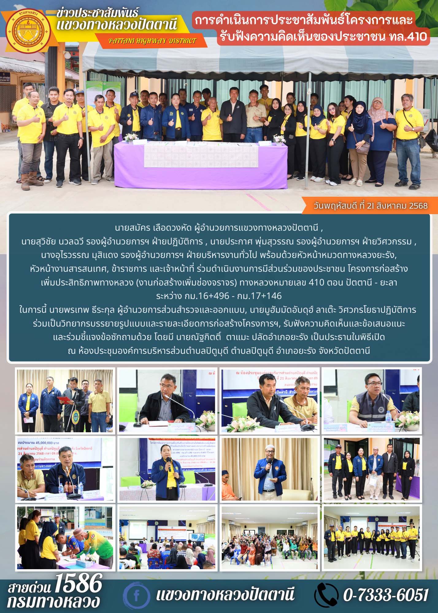 หัวหน้างานสารสนเทศ, ข้าราชการ และเจ้าหน้าที่ ร่วมดำเนินงานการมีส่วนร่วมของประชาชน โครงการก่อสร้างเพิ่มประสิทธิภาพทางหลวง (งานก่อสร้างเพิ่มช่องจราจร) ทางหลวงหมายเลข 410 ตอน ปัตตานี - ยะลา
