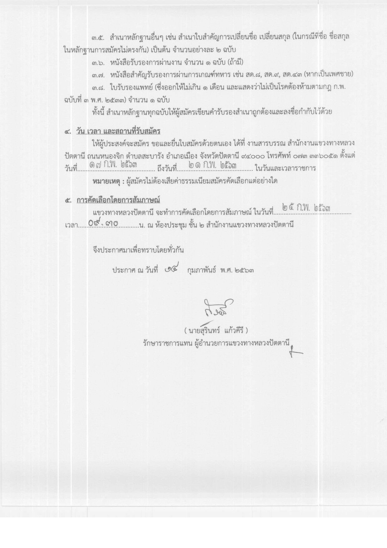 ด้วยแขวงทางหลวงปัตตานี สังกัดสำนักงานทางหลวงที่ 18 กรมทางหลวง มีความประสงค์จะรับสมัครบุคคลเพื่อคัดเลือกเป็นลูกจ้างชั่วคราวรายวัน (คนพิการ) ให้ผู้ประสงค์จะสมัคร ขอและยื่นใบสมัครด้วยตนเองที่ งานสารบรรณ แขวงทางหลวงปัตตานี ตั้งแต่วันที่ 17-21 ก.พ.2563