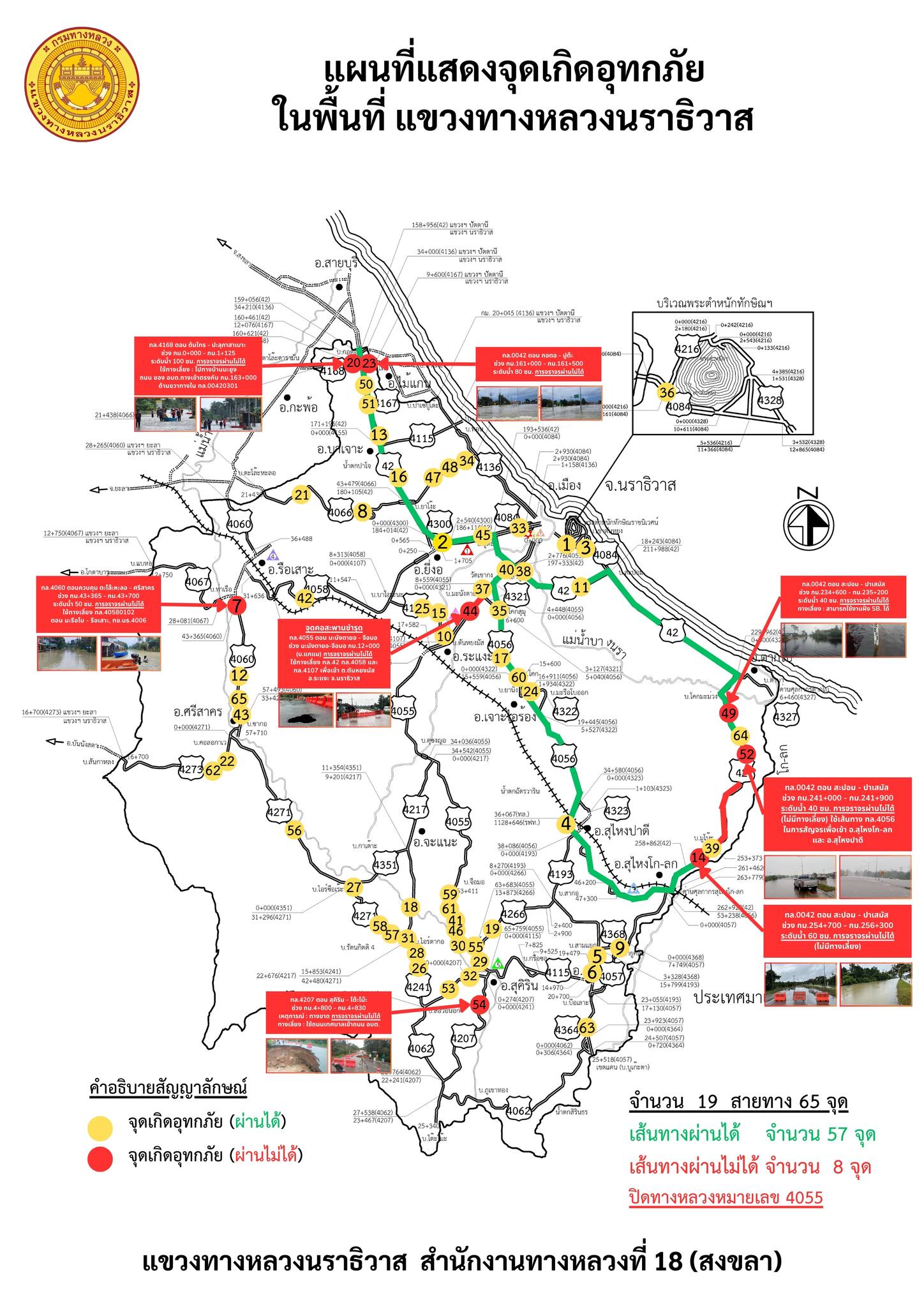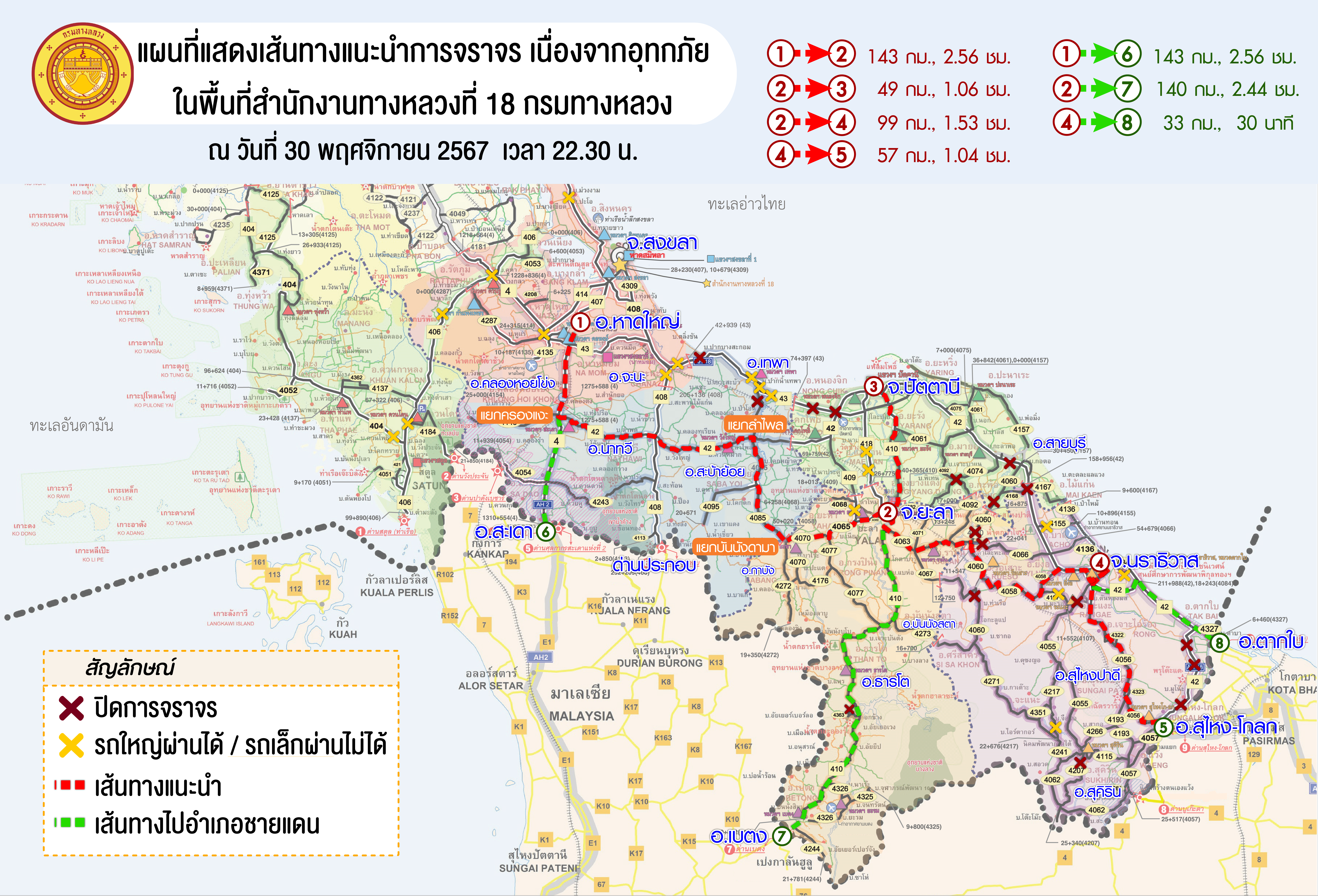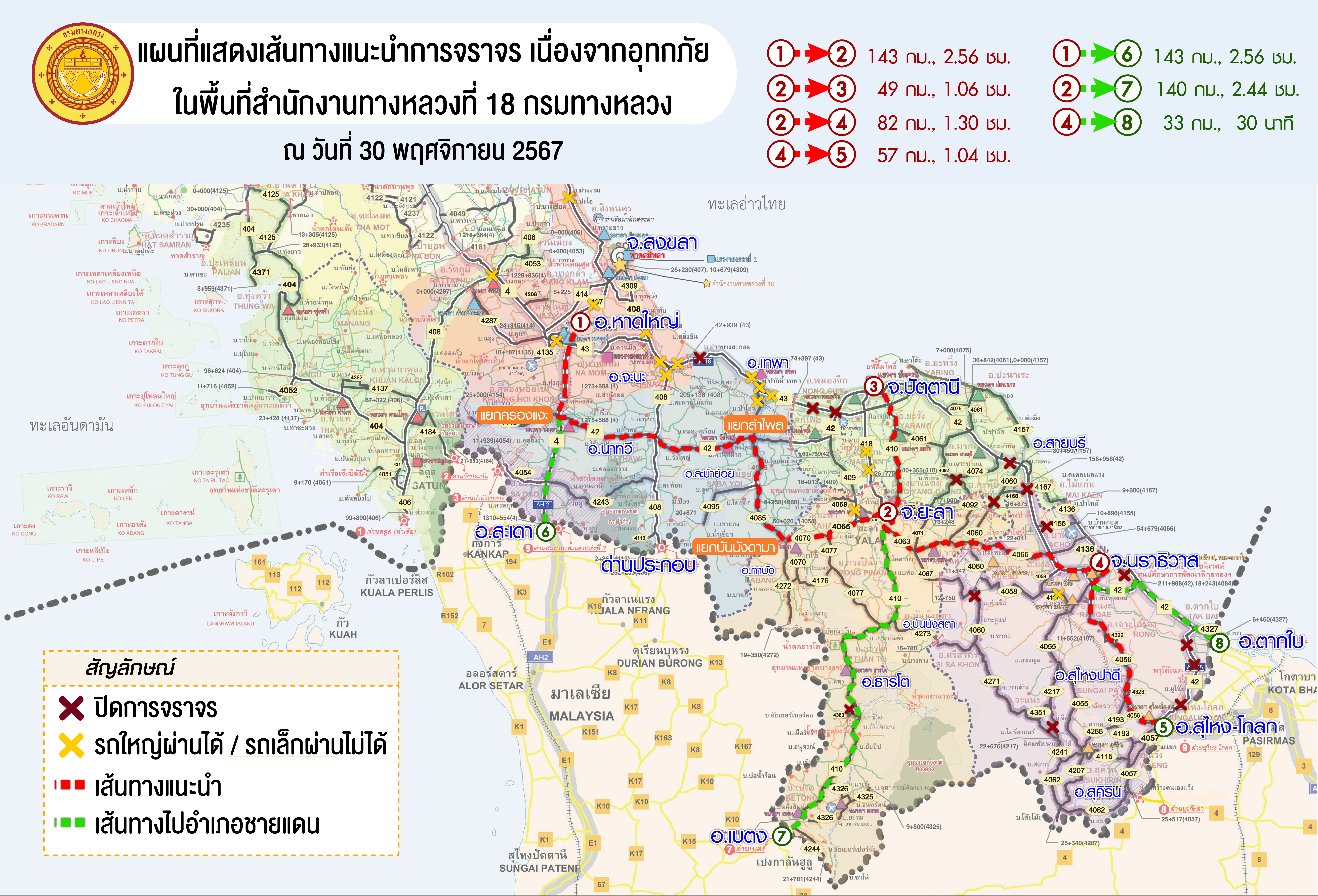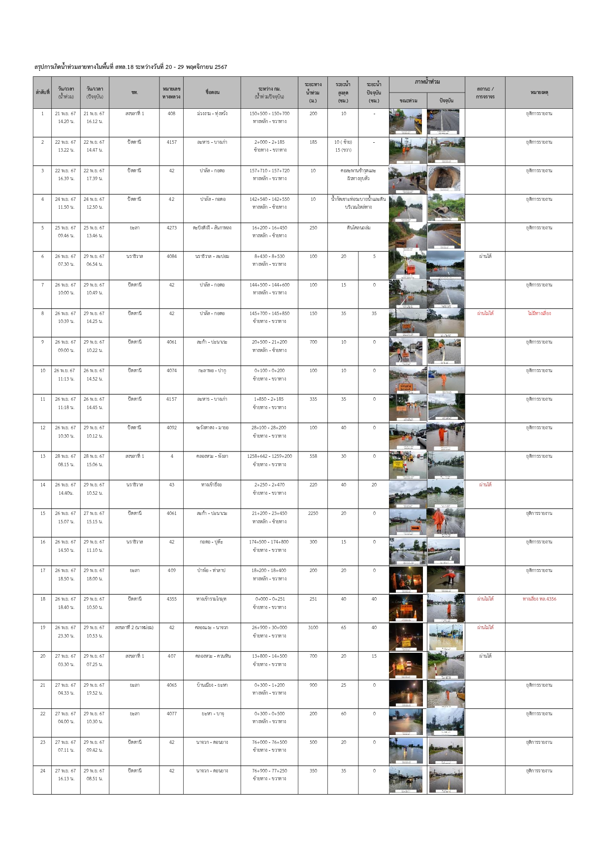 แขวงทางหลวงนราธิวาส ขอรายงานสถานการณ์อุทกภัยในพื้นที่จังหวัดนราธิวาส วันเวลาที่ update วันที่ 30 พ.ย. 67 เวลา 16.00 น.