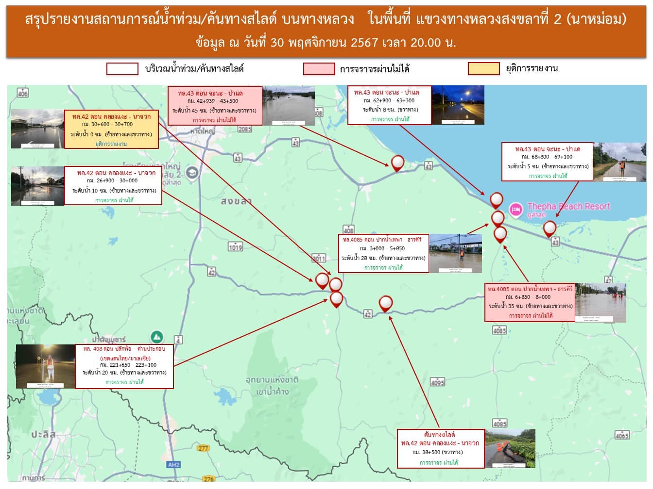 อัพเดทสถานการณ์น้ำท่วมของแขวงทางหลวงสงขลาที่2 (นาหม่อม) ณ วันที่ 30 พฤศจิกายน 2567 เวลา 06.00 น.