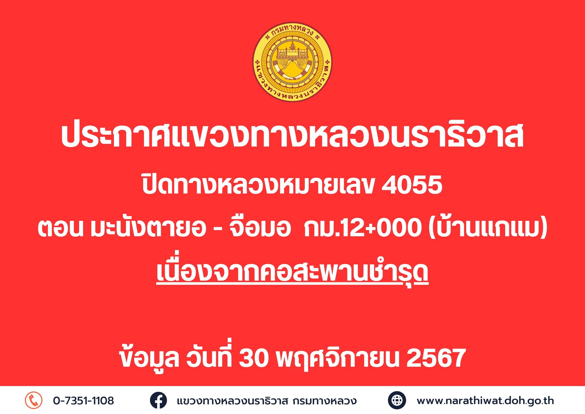 แขวงทางหลวงนราธิวาส ขอปิดทางหลวงหมายเลข 4055 เนื่องจากคอสะพานชำรุด