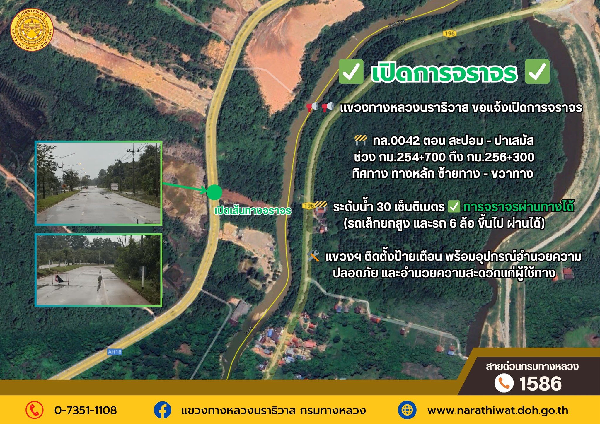 แขวงทางหลวงนราธิวาสขอแจ้งเปิดการจราจร ทางหลวงหมายเลข 0042 ตอน สะปอม - ปาเสมัส ข้อมูล วันที่ 1 ธันวาคม 2567