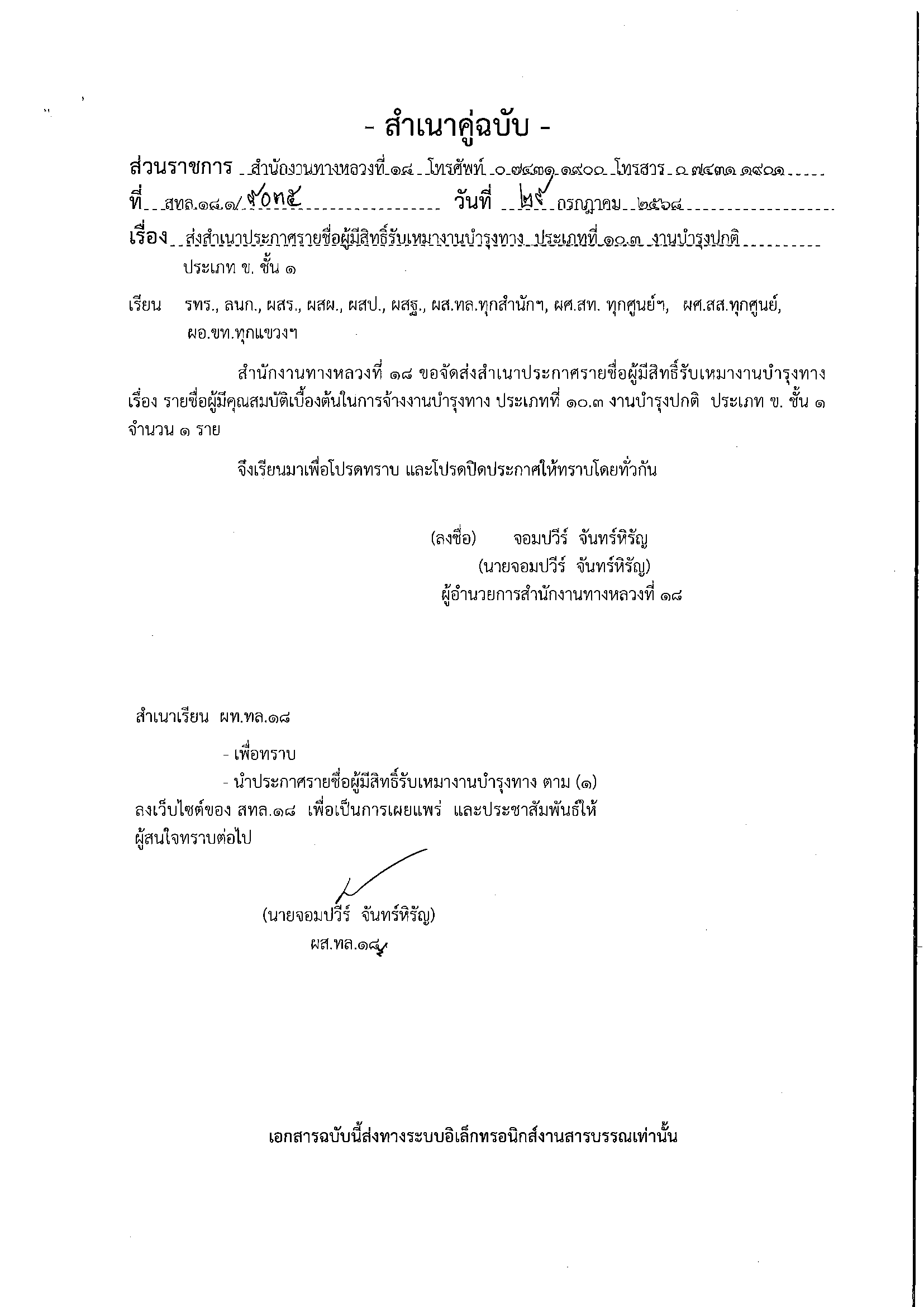 ประกาศสำนักงานทางหลวงที่ 18