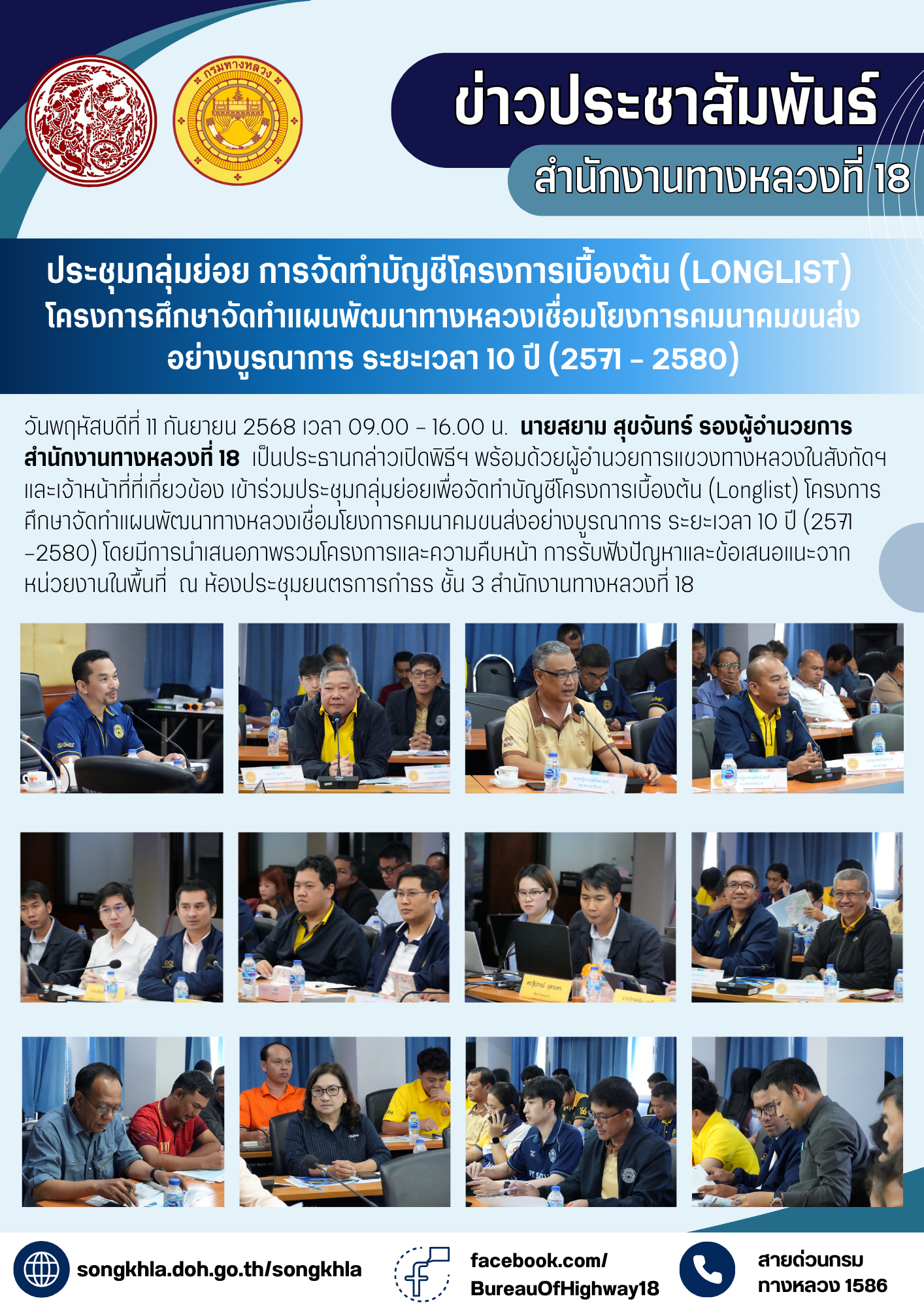 สำนักงานหลวงที่ 18 ร่วมกับสำนักแผนงาน จัดประชุมกลุ่มย่อยเพื่อจัดทำบัญชีโครงการเบื้องต้น (Longlist) โครงการศึกษาจัดทำแผนพัฒนาทางหลวงเชื่อมโยงการคมนาคมขนส่งอย่างบูรณาการ ระยะเวลา 10 ปี (2571-2580)
