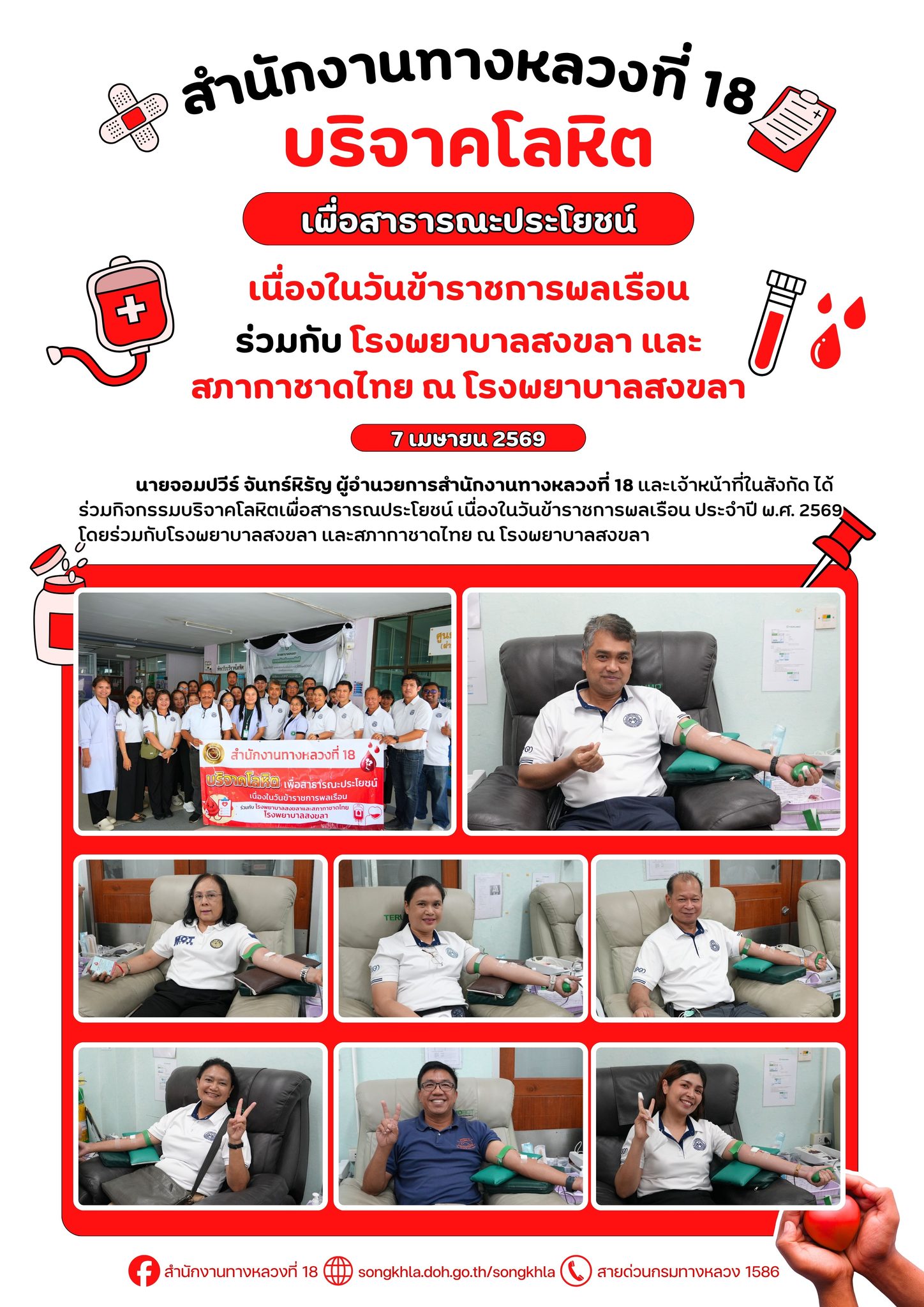 วันที่ 7 เมษายน 2569 เวลา 09.00 น. นายจอมปวีร์ จันทร์หิรัญ ผู้อำนวยการสำนักงานทางหลวงที่ 18 และเจ้าหน้าที่ในสังกัด ได้ร่วมกิจกรรมบริจาคโลหิตเพื่อสาธารณประโยชน์ เนื่องในวันข้าราชการพลเรือน ประจำปี พ.ศ. 2569 โดยร่วมกับโรงพยาบาลสงขลา และสภากาชาดไทย ณ โรงพยาบาลสงขลา