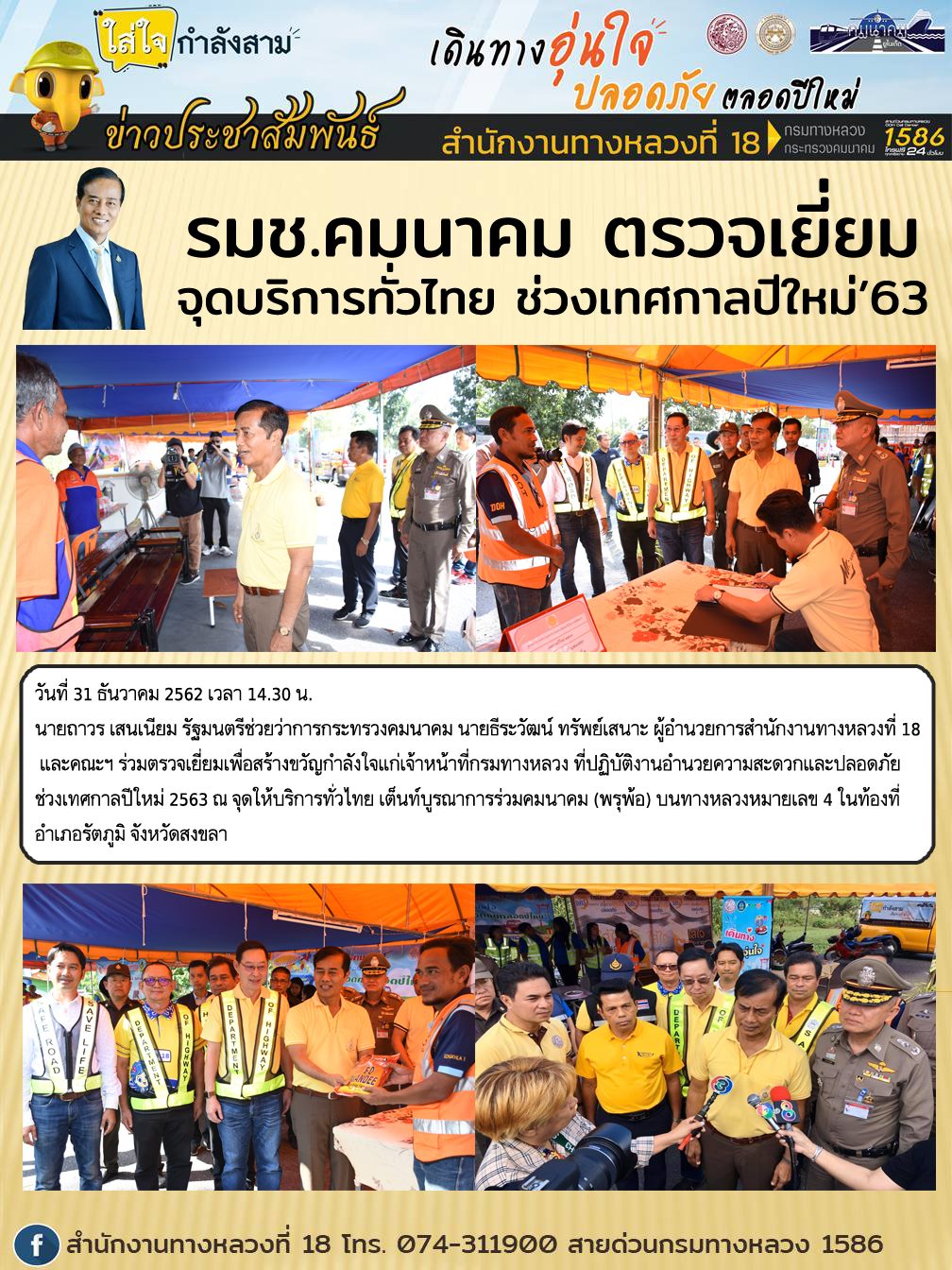 วันอังคารที่ 7 มกราคม 2563 นายครรชิตพล เนตรสุวรรณ รองผู้อำนวยการสำนักงานทางหลวงที่ 18 พร้อมด้วยนายวิฑูรย์ อัตตเกษม ผู้อำนวยการแขวงทางหลวงสงขลาที่ 2 (นาหม่อม) ร่วมตรวจรับงาน กิจกรรมก่อสร้างปรับปรุง สะพานและอาคารระบายน้ำ ทางหลวงหมายเลข 43 ตอนควบคุม 0201 ตอน นาหม่อม - จะนะ ระหว่าง กม.12+160 - กม.12+900 ซึ่งอยู่ระหว่างดำเนินการก่อสร้างและผู้รับจ้างได้ขอส่งงานงวดที่ 2 ประจำเดือน ธันวาคม 2562 ตามสัญญาที่ สข.2/15/2562 ลงวันที่ 18 ตุลาคม 2561