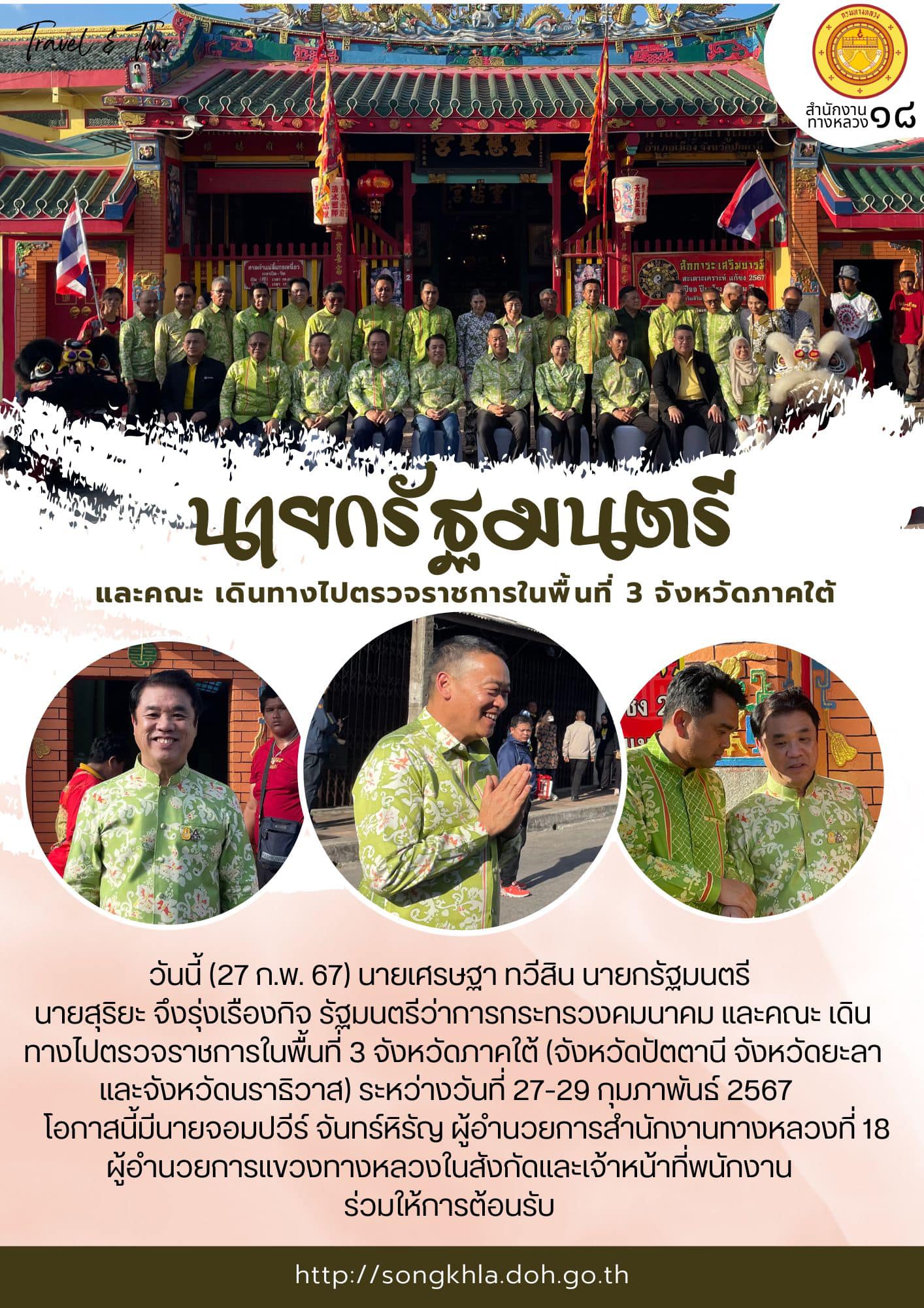 วันนี้ (27 ก.พ. 67) นายเศรษฐา ทวีสิน นายกรัฐมนตรี นายสุริยะ จึงรุ่งเรืองกิจ รัฐมนตรีว่าการกระทรวงคมนาคม และคณะ เดินทางไปตรวจราชการในพื้นที่ 3 จังหวัดภาคใต้ (จังหวัดปัตตานี จังหวัดยะลา และจังหวัดนราธิวาส) ระหว่างวันที่ 27-29 กุมภาพันธ์ 2567