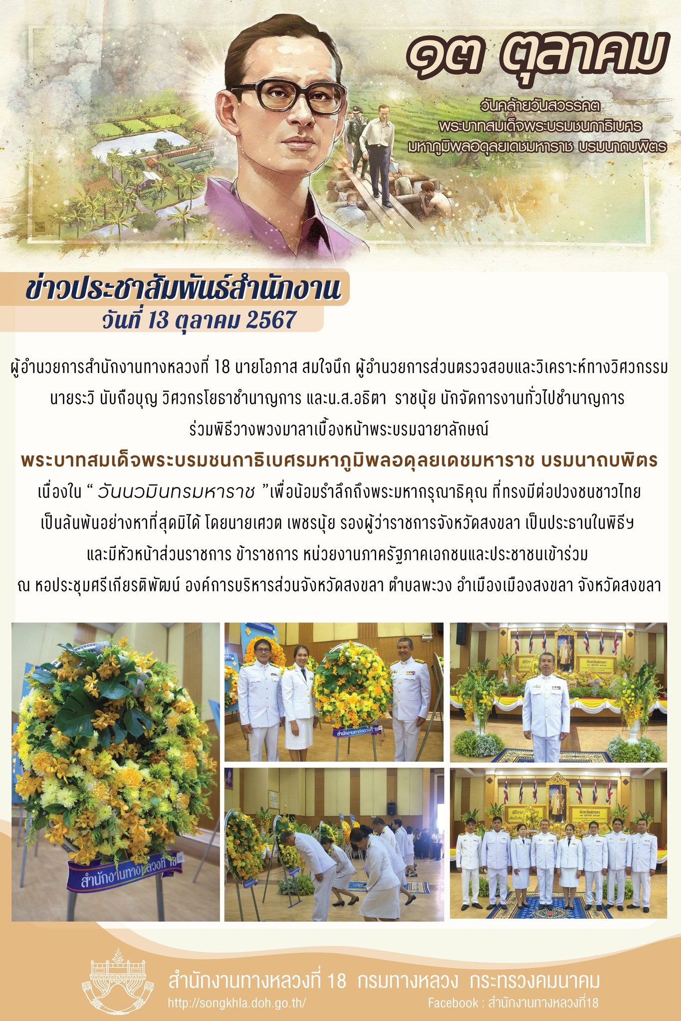 วันอาทิตย์ที่ 13 ตุลาคม 2567 ผู้อำนวยการสำนักงานทางหลวงที่ 18 มอบหมายให้ นายโอภาส สมใจนึก ผู้อำนวยการส่วนตรวจสอบและวิเคราะห์ทางวิศวกรรม นายระวิ นับถือบุญ วิศวกรโยธาชำนาญการ และน.ส.อธิตา ราชนุ้ย นักจัดการงานทั่วไปชำนาญการ ร่วมพิธีวางพวงมาลาเบื้องหน้าพระบรมฉายาลักษณ์ พระบาทสมเด็จพระบรมชนกาธิเบศรมหาภูมิพลอดุลยเดชมหาราช บรมนาถบพิตร เนื่องใน “วันนวมินทรมหาราช” เพื่อน้อมรำลึกถึงพระมหากรุณาธิคุณ ที่ทรงมีต่อปวงชนชาวไทย เป็นล้นพ้นอย่างหาที่สุดมิได้