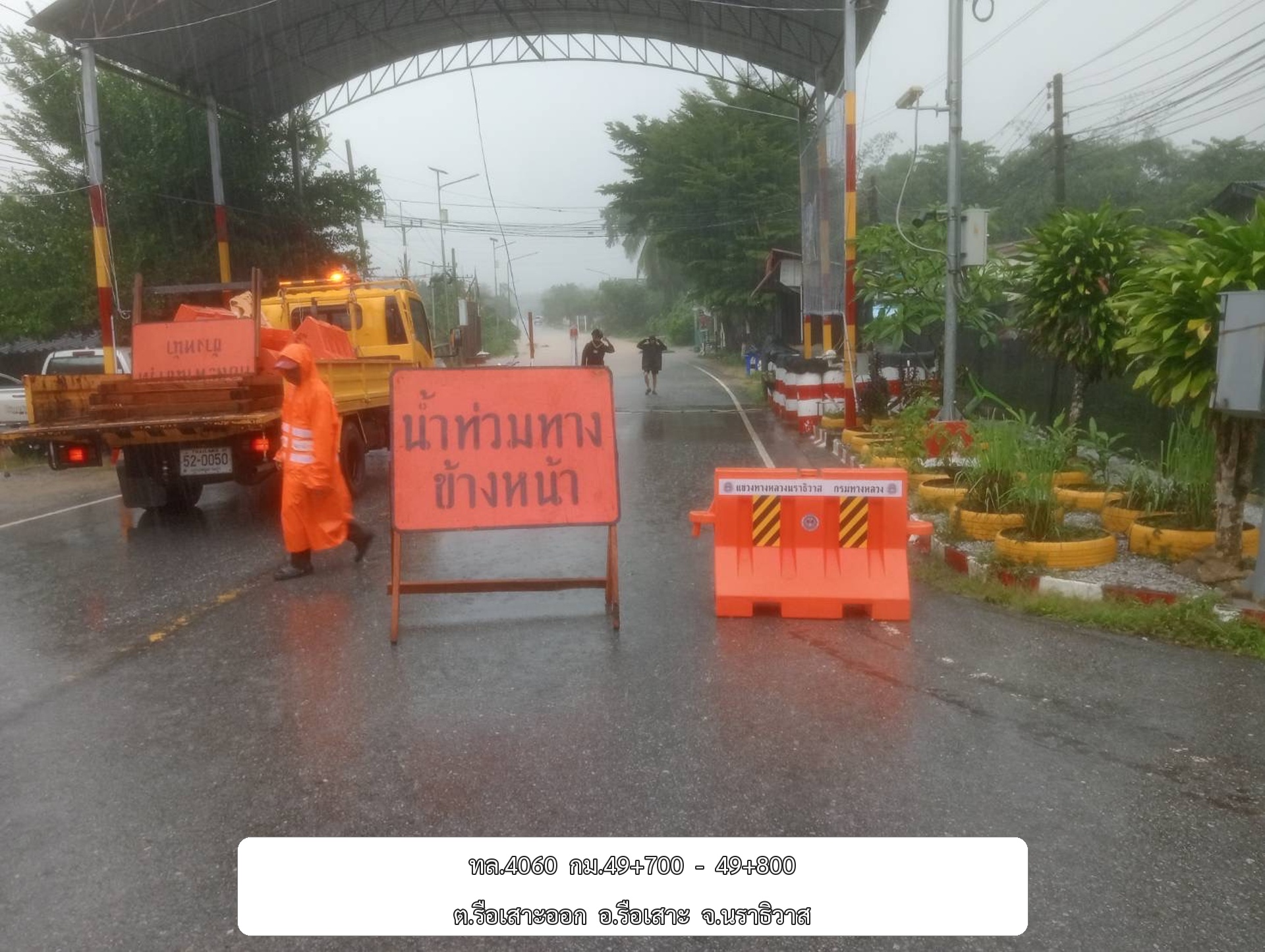 วันที่ 27 พฤศจิกายน 2567 เวลา 11.05 น. รายงานสถานการณ์น้ำท่วม หมายเลขทางหลวง 4060 ตอน ตะโล๊ะหะลอ - ศรีสาคร ช่วง กม. 49+700 ถึง 49+800 เนื่องจากฝนตกหนักน้ำไหลผ่านอย่างรวดเร็วทำให้เกิดน้ำท่วมถนน ปริมาณระดับน้ำ 60 เซ็นติเมตร การจราจรไม่สามารถผ่านได้ ทั้งนี้ แขวงทางหลวงนราธิวาส ได้ดำเนินการติดตั้งป้ายเตือนจราจรผู้ใช้เส้นทาง เพื่ออำนวยความสะดวก