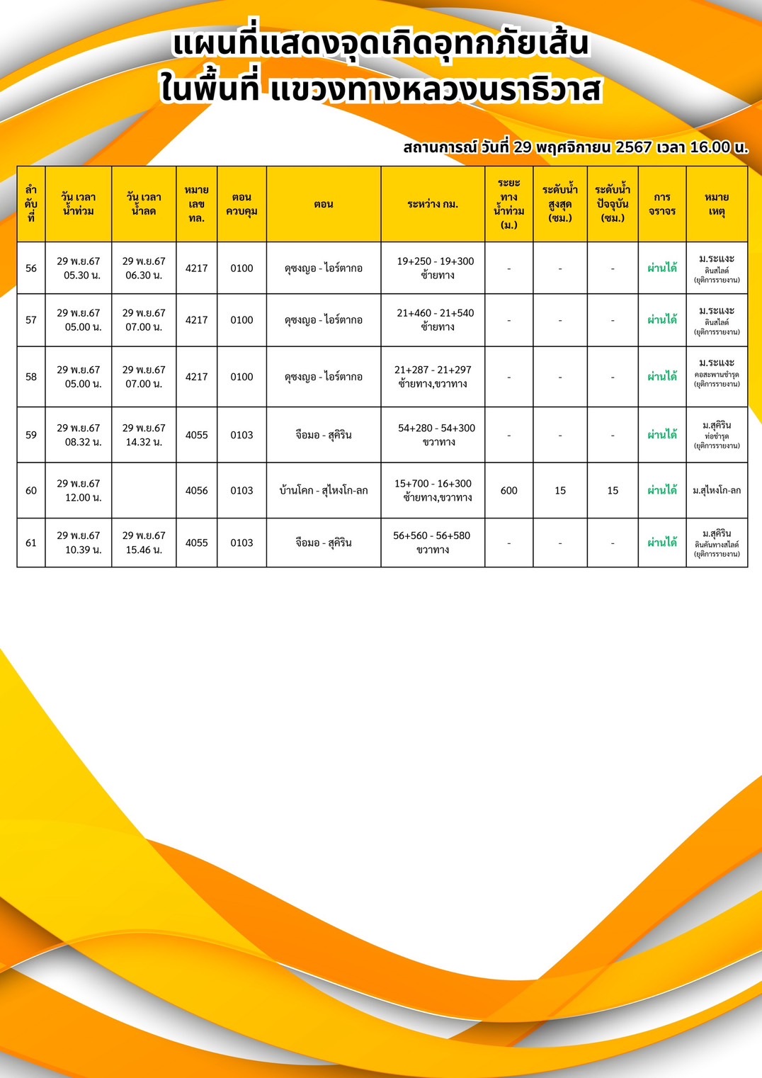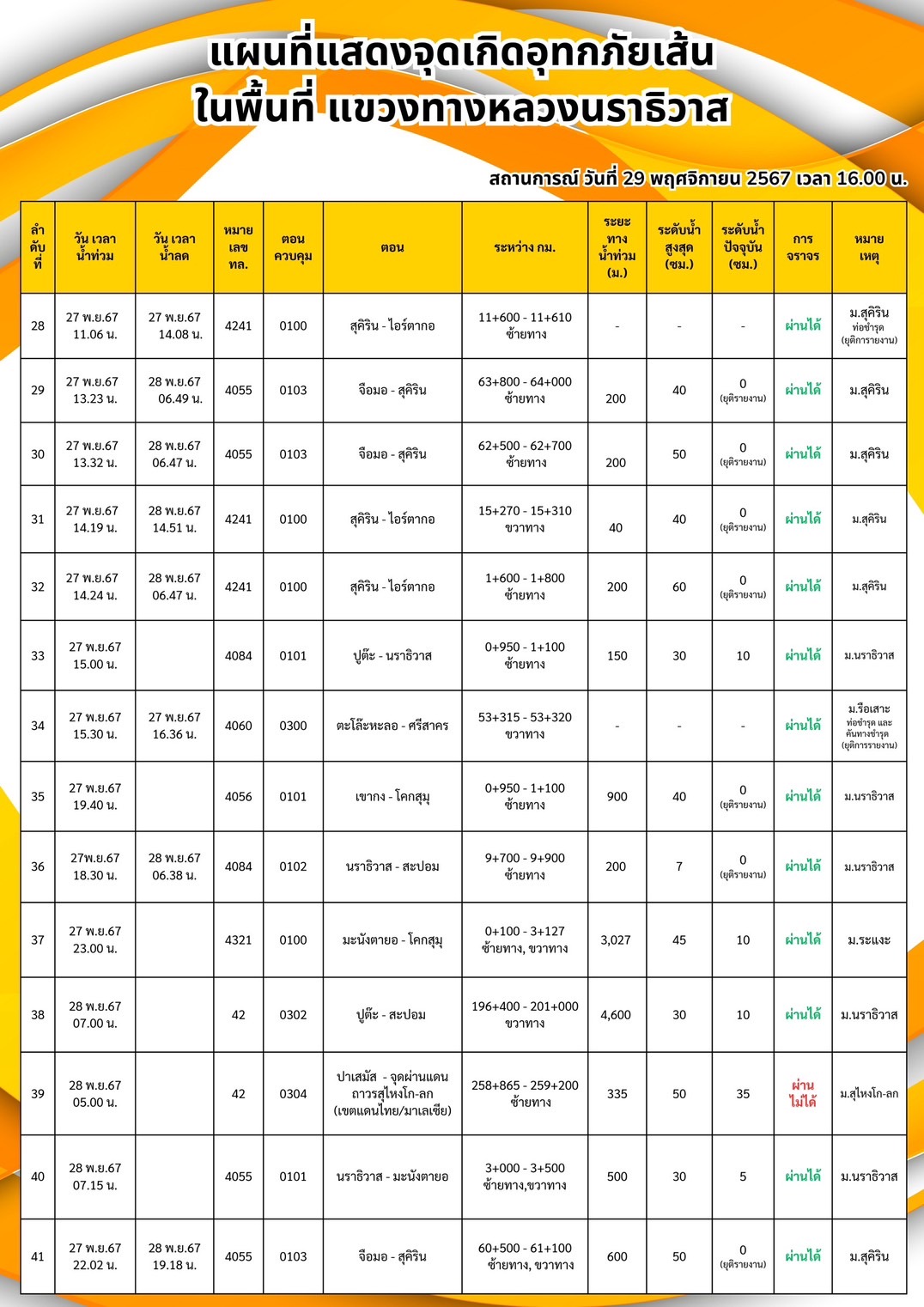 ข้อมูลข่าว : แผนที่แสดงจุดเกิดอุทกภัยในพื้นที่แขวงทางหลวงนราธิวาส ข้อมูล ณ วันที่ 26-29 พฤศจิกายน 2567 เวลา 16.00 น.