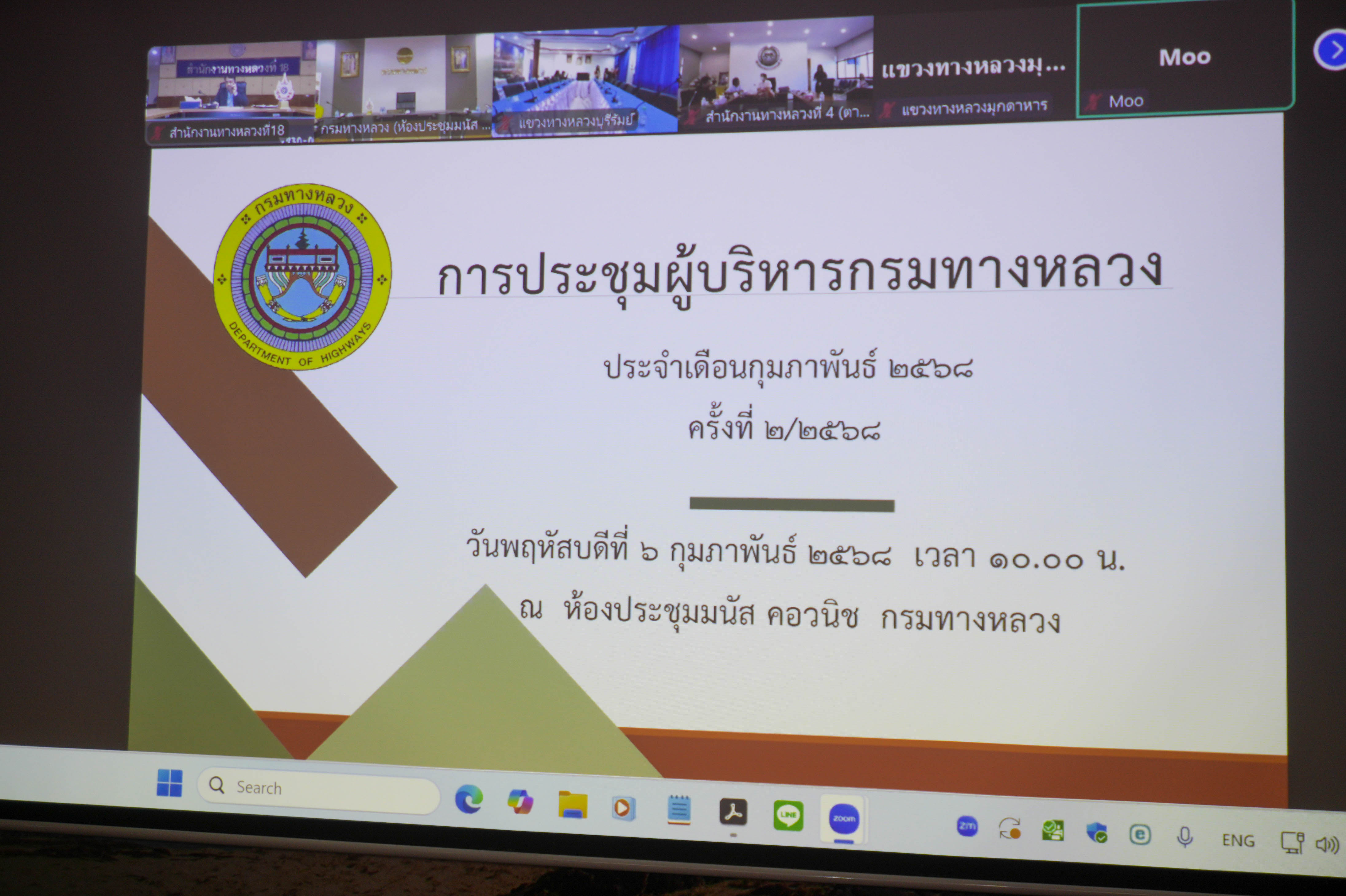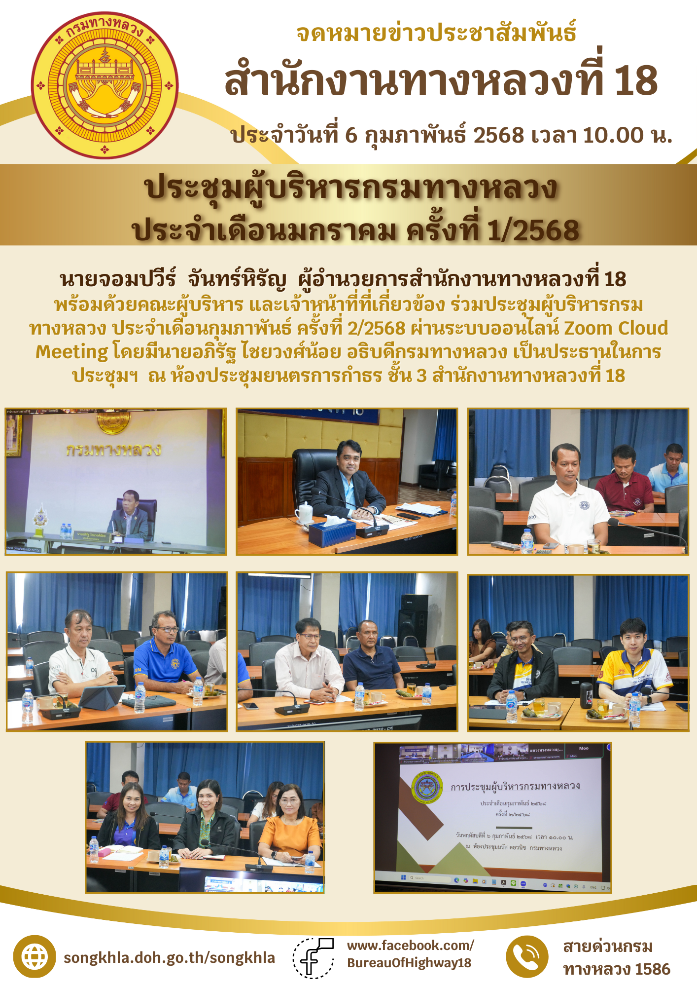 วันที่ 6 กุมภาพันธ์ 2568 เวลา 10.00 น. นายจอมปวีร์ จันทร์หิรัญ ผู้อำนวยการสำนักงานทางหลวงที่ 18 พร้อมด้วยคณะผู้บริหาร และเจ้าหน้าที่ที่เกี่ยวข้อง เข้าร่วมประชุมผู้บริหารกรมทางหลวง ประจำเดือนกุมภาพันธ์ ครั้งที่ 2/2568 โดยมีนายอภิรัฐ ไชยวงศ์น้อย อธิบดีกรมทางหลวง เป็นประธานการประชุมทางไกล ด้วยระบบ Zoom Cloud Meeting ณ ห้องประชุมยนตรการกำธร ชั้น 3 สำนักงานทางหลวงที่ 18 ในการประชุมครั้งนี้ นายอภิรัฐ ไชยวงศ์น้อย อธิบดีกรมทางหลวง ได้เป็นประธานในรายงานผลการเบิกจ่ายงบประมาณร่ายจ่ายประจำเดือนมกราคม 2568 รายงานการดำเนินงานตามข้อทักท้วง ของสำนักงานการตรวจเงินแผ่นดิน และแผนการจัดซื้อจัดจ้างของกรมทางหลวง