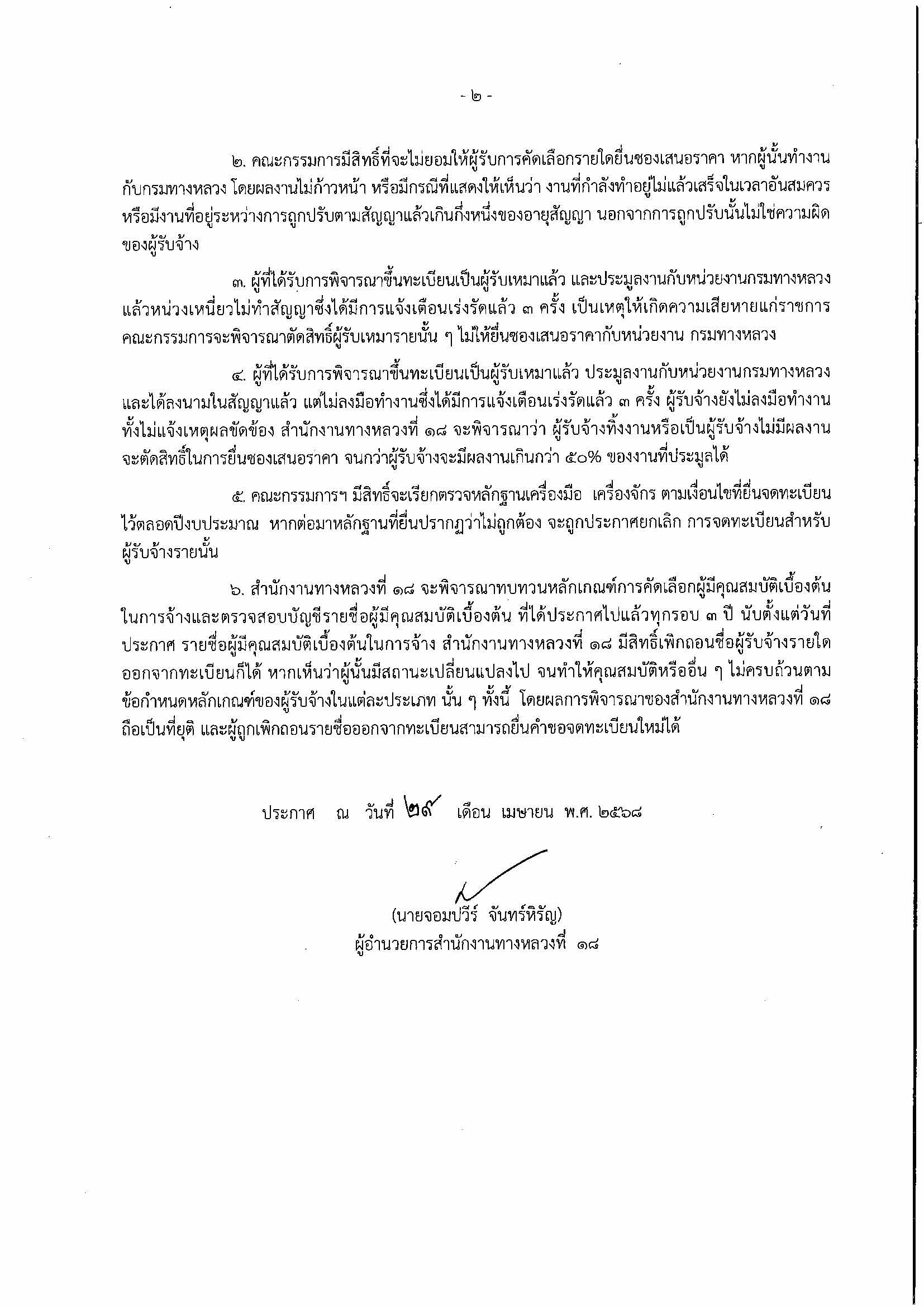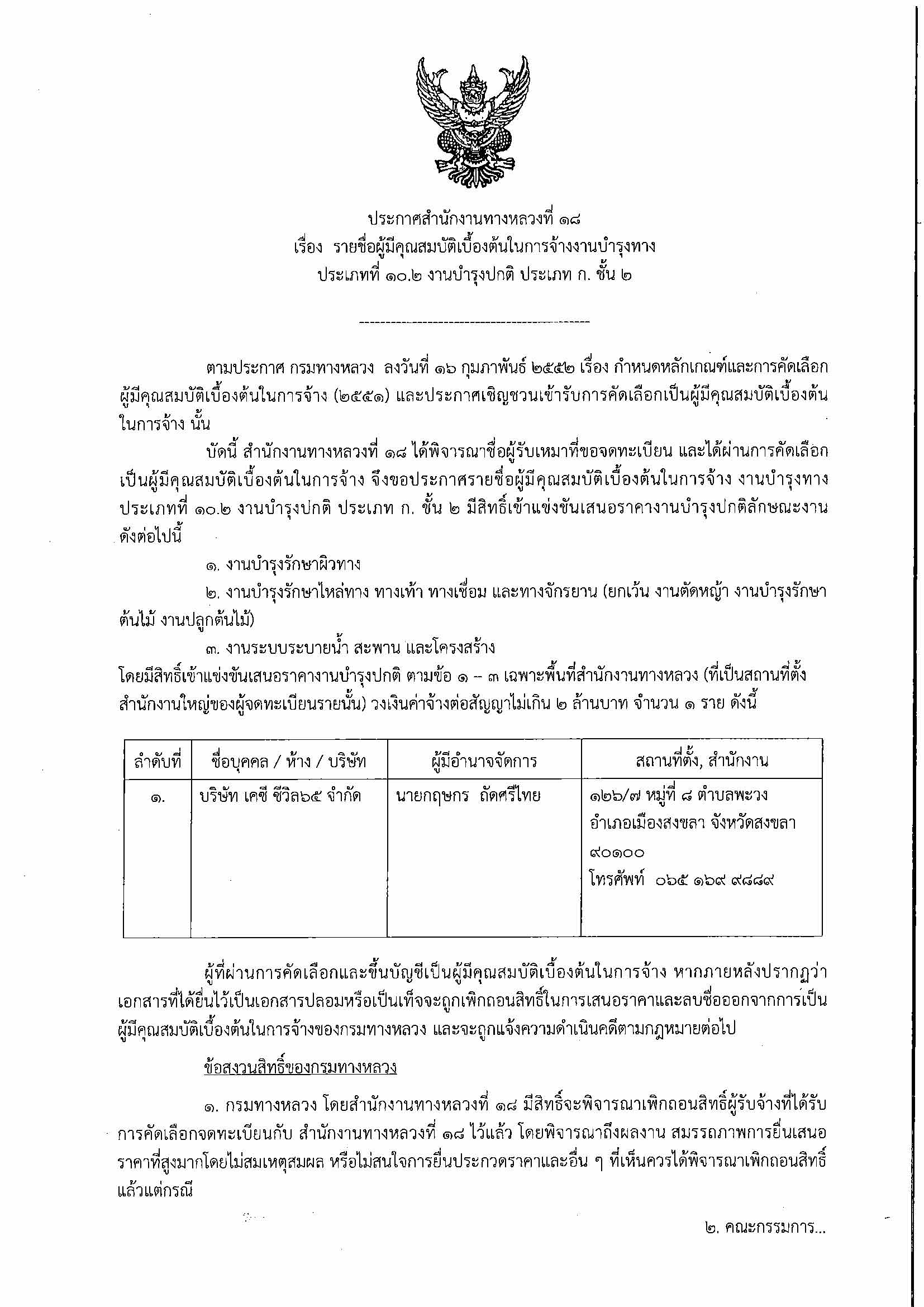 ประกาศรายชื่อผู้มีคุณสมบัติเบื้องต้นในการจ้างงานบำรุงทาง ประเภทที่ 10.2 งานบำรุงทางปกติ ประเภท ก. ชั้น 2
