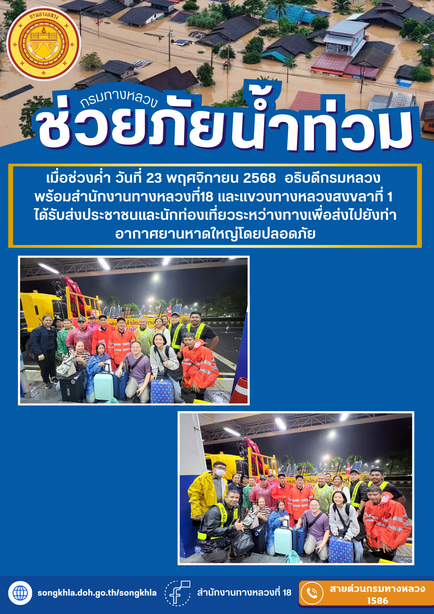 เมื่อช่วงค่ำ วันที่ 23 พฤศจิกายน 2568 นายปิยพงษ์ จิวัฒนกุลไพศาล อธิบดีกรมทางหลวง พร้อมด้วยนายจอมปวีร์ จันทร์หิรัญ ผู้อำนวยการสำนักงานทางหลวงที่18 พร้อมด้วยคณะผู้บริหารและเจ้าหน้าที่ในสังกัด ได้รับส่งประชาชนและนักท่องเที่ยวระหว่างทางเพื่อส่งไปยังท่าอากาศยานหาดใหญ่โดยปลอดภัย