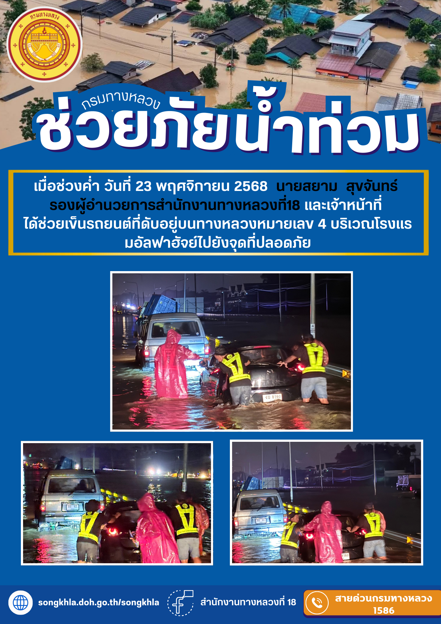 เมื่อช่วงค่ำ วันที่ 23 พฤศจิกายน 2568 นายสยาม สุขจันทร์ รองผู้อำนวยการสำนักงานทางหลวงที่18 และเจ้าหน้าที่ ได้ช่วยเข็นรถยนต์ที่ดับอยู่บนทางหลวงหมายเลข 4 บริเวณโรงแรมอัลฟาฮัจย์ไปยังจุดที่ปลอดภัย