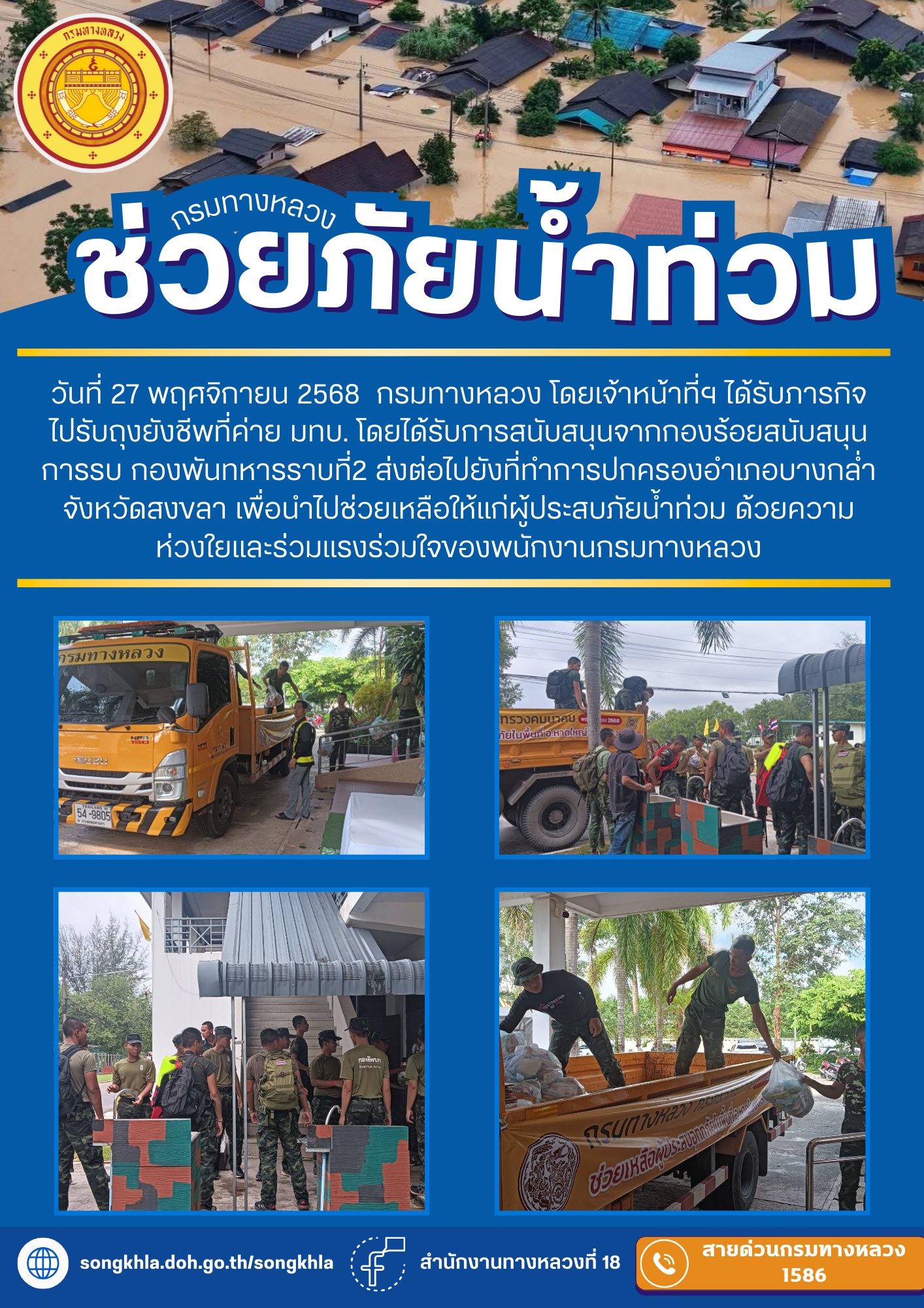 วันที่ 27 พฤศจิกายน 2568 กรมทางหลวง โดยเจ้าหน้าที่ฯ ได้รับภารกิจไปรับถุงยังชีพที่ค่าย มทบ. โดยได้รับการสนับสนุนจากกองร้อยสนับสนุนการรบ กองพันทหารราบที่2 ส่งต่อไปยังที่ทำการปกครองอำเภอบางกล่ำ จังหวัดสงขลา เพื่อนำไปช่วยเหลือให้แก่ผู้ประสบภัยน้ำท่วม ด้วยความห่วงใยและร่วมแรงร่วมใจของพนักงานกรมทางหลวง