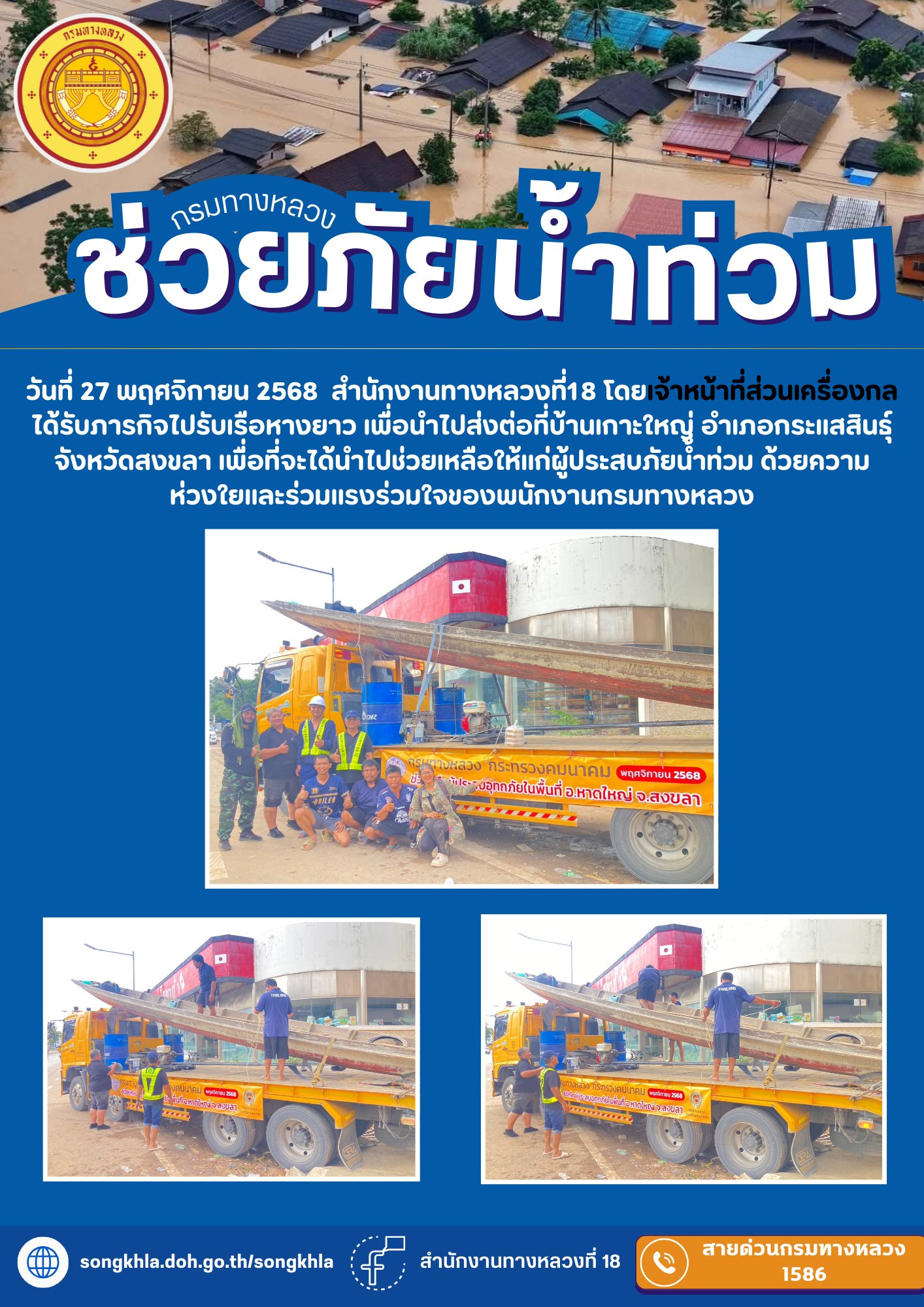 วันที่ 27 พฤศจิกายน 2568 สำนักงานทางหลวงที่18 โดยเจ้าหน้าที่ส่วนเครื่องกล ได้รับภารกิจไปรับเรือหางยาว เพื่อนำไปส่งต่อที่บ้านเกาะใหญ่ อำเภอกระแสสินธุ์ จังหวัดสงขลา เพื่อที่จะได้นำไปช่วยเหลือให้แก่ผู้ประสบภัยน้ำท่วม ด้วยความห่วงใยและร่วมแรงร่วมใจของพนักงานกรมทางหลวง