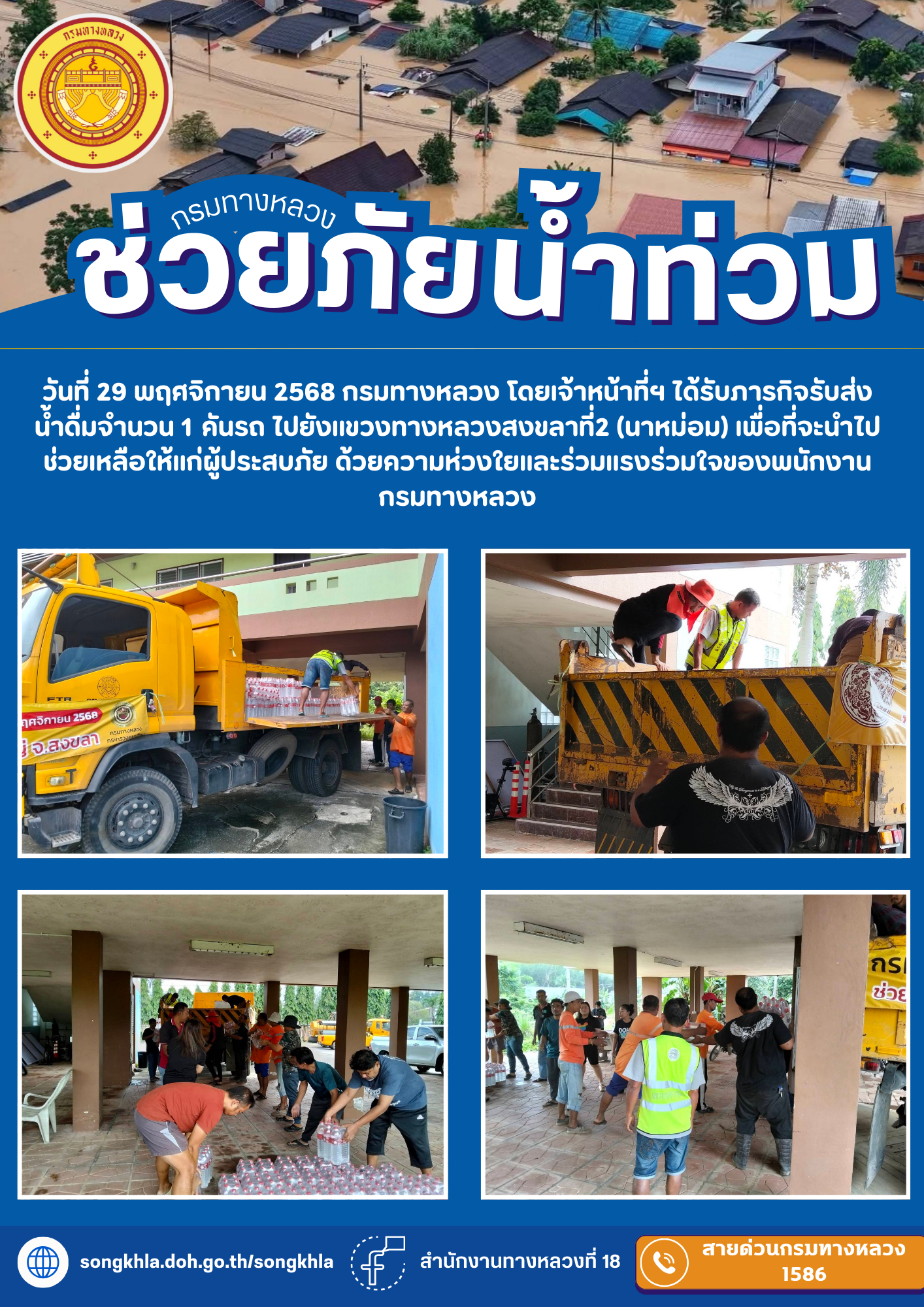 วันที่ 29 พฤศจิกายน 2568 กรมทางหลวง โดยเจ้าหน้าที่ฯ ได้รับภารกิจรับส่งน้ำดื่มไปยังแขวงทางหลวงสงขลาที่2 (นาหม่อม) เพื่อที่จะนำไปช่วยเหลือให้แก่ผู้ประสบภัย ด้วยความห่วงใยและร่วมแรงร่วมใจของพนักงานกรมทางหลวง